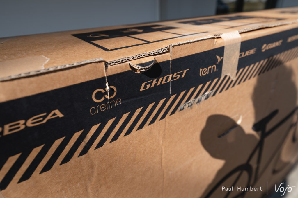Le carton lui-même est arrivé en bon état et pas plus marqué qu’au départ, signe qu’il a été bien traité tout au long du transport et que le vélo était bien emballé à l’intérieur. Petit conseil, pensez à bien renforcer le fond du carton : c’est la partie la plus susceptible de s’abîmer, à force de déplacer le colis et de le faire glisser. Les angles sont particulièrement importants mais même sur la longueur, il ne faut pas hésiter à soigner le travail pour être certain que tout se passe bien pendant le trajet.