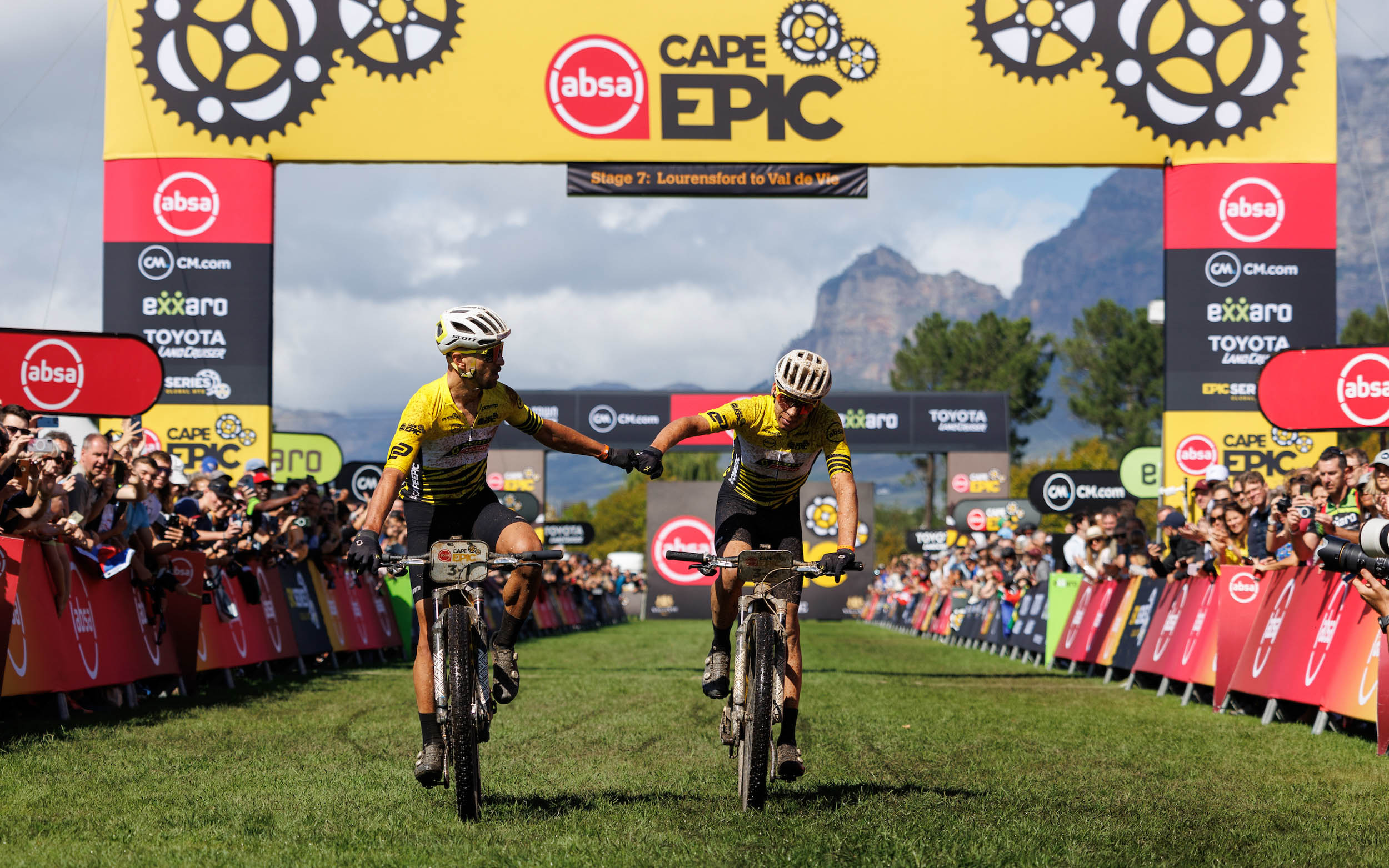 Voilà le premier équipage à se présenter sur la ligne d’arrivée de cette étape finale du Cape Epic 2023, et il s’agit des vainqueurs en titre, Georg Egger et Lukas Baum (Orbea X Leatt X Speed Company). Les deux hommes ont bouclé cette édition en 26 heures, 20 minutes et 53 secondes.