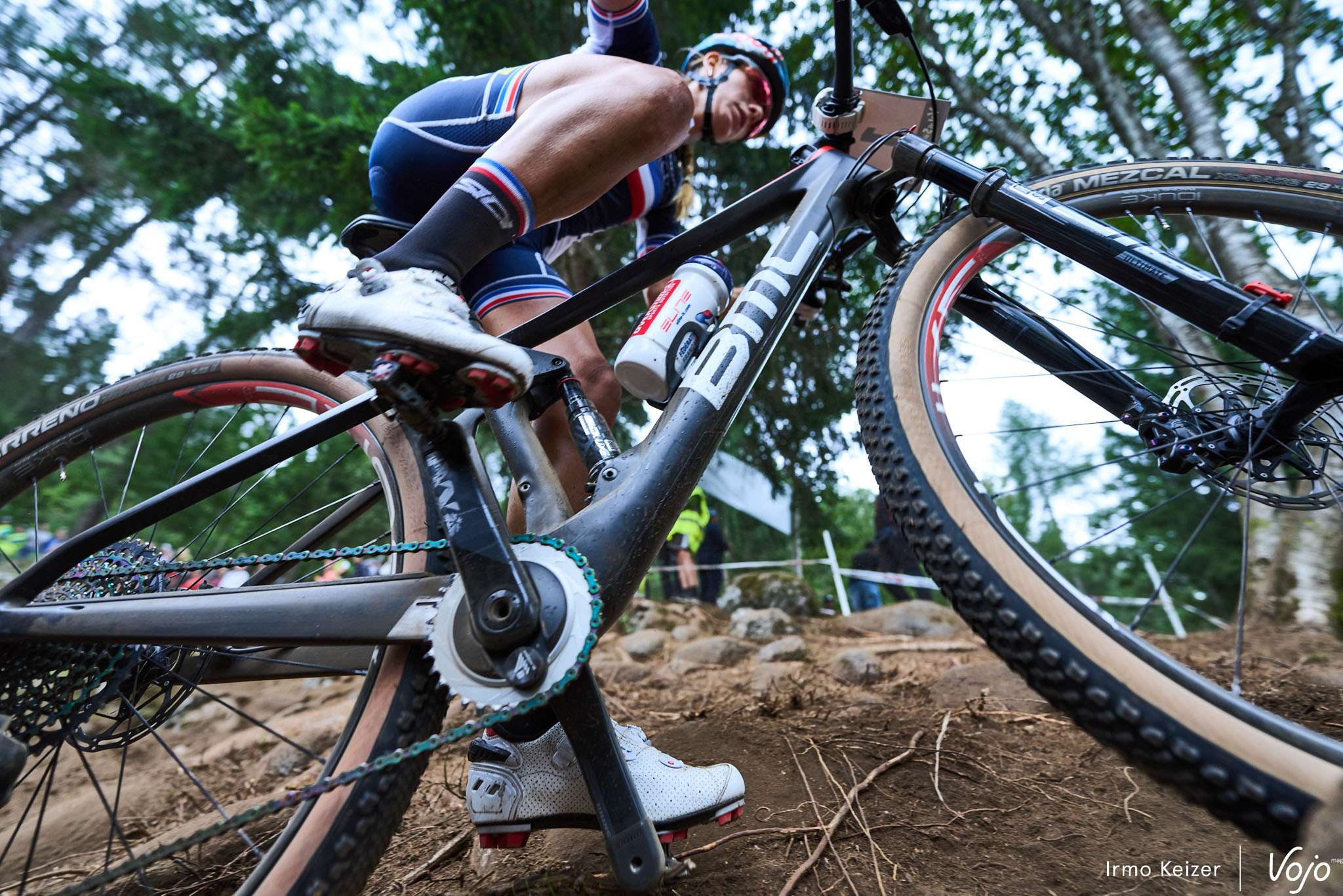 Un peu plus loin, un groupe de cinq semble parti pour se disputer la troisième place. Anne Terpstra revient d’abord sur Sina Frei, puis les deux pilotes sont rejointes par Jolanda Neff et Rebecca McConnell et enfin par Maja Wloszczowksa, qui se verrait bien décrocher une médaille pour ses tous derniers championnats du monde.