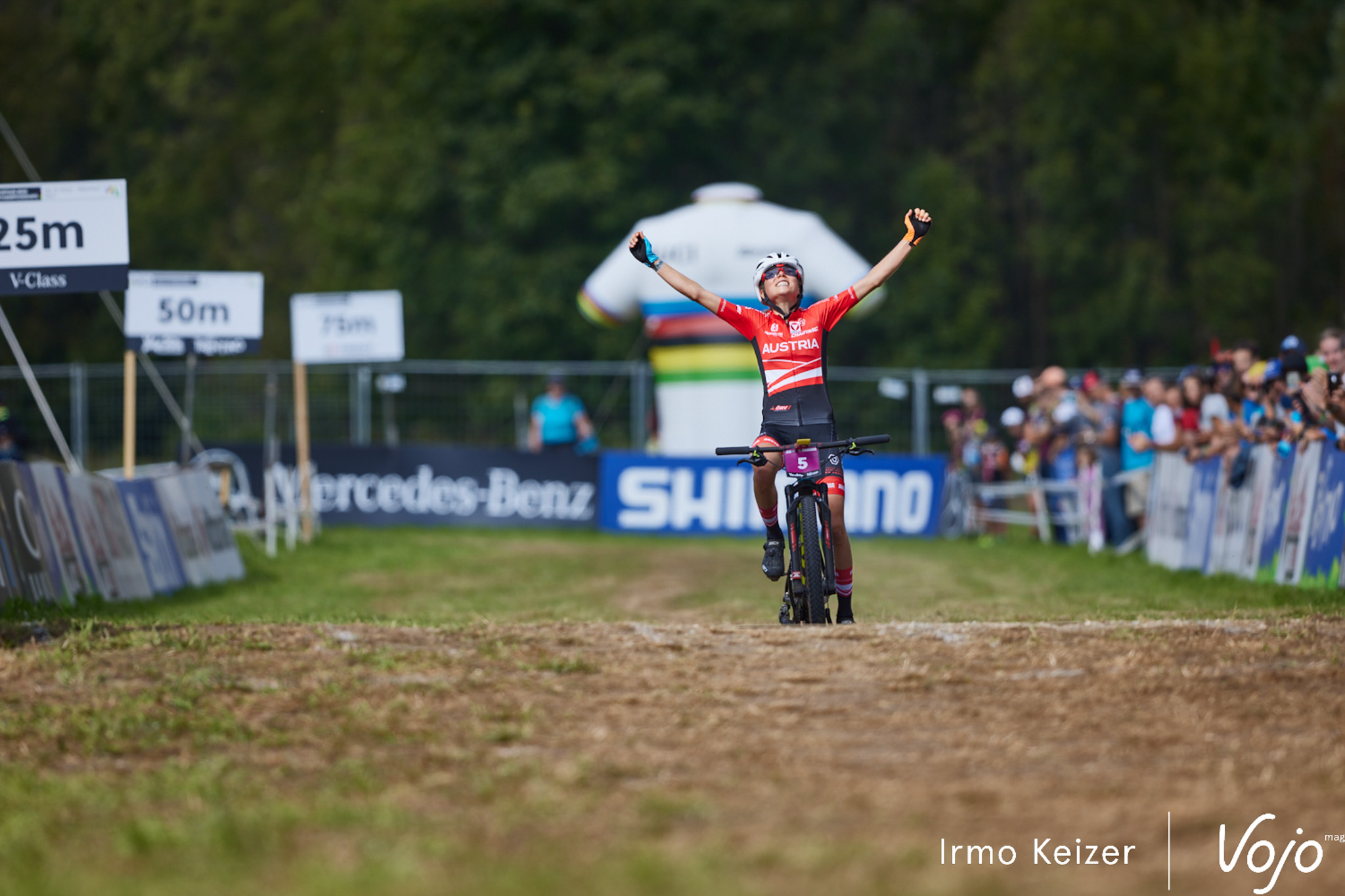 Largement dominante en coupe du Monde U23 alors que ce n’est que sa première saison dans la catégorie, Mona Mitterwallner s’impose en solitaire chez les femmes et remporte son deuxième titre mondial toutes catégories confondues, après celui acquis chez les Juniors l’année dernière. Elle devance sa compatriote Laura Stigger (qui est surclassée chez les Elites en coupe du Monde) et l’une de ses dauphines habituelles sur les podiums, la danoise Caroline Bohe. 4e des Jeux Olympiques, la Hongroise Blanka Vas se classe ici 5e derrière l’Italienne Marika Tovo.