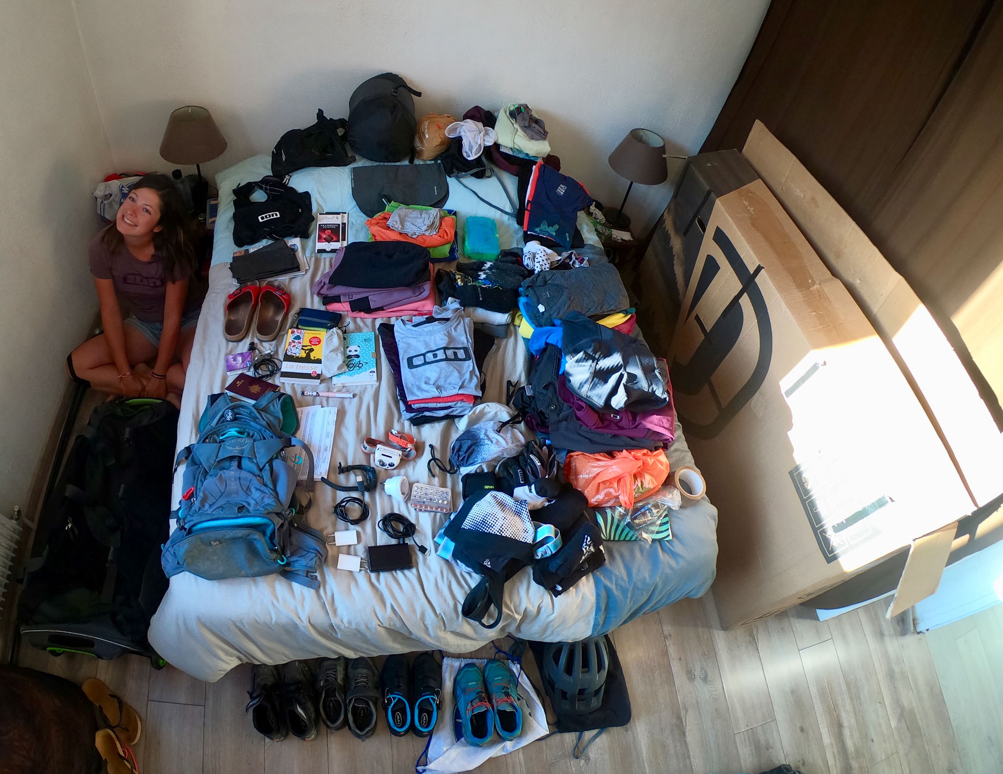 Arrive le moment de préparer les affaires. Dans la « check list » de la Trans-Cascadia, on nous dit bien de tout prendre en double (voire triple), et surtout d’avoir des vêtements de pluie et chauds. Je me demande où je vais bien pouvoir faire rentrer ça, mais voilà, le vélo est emballé, le sac est bouclé !