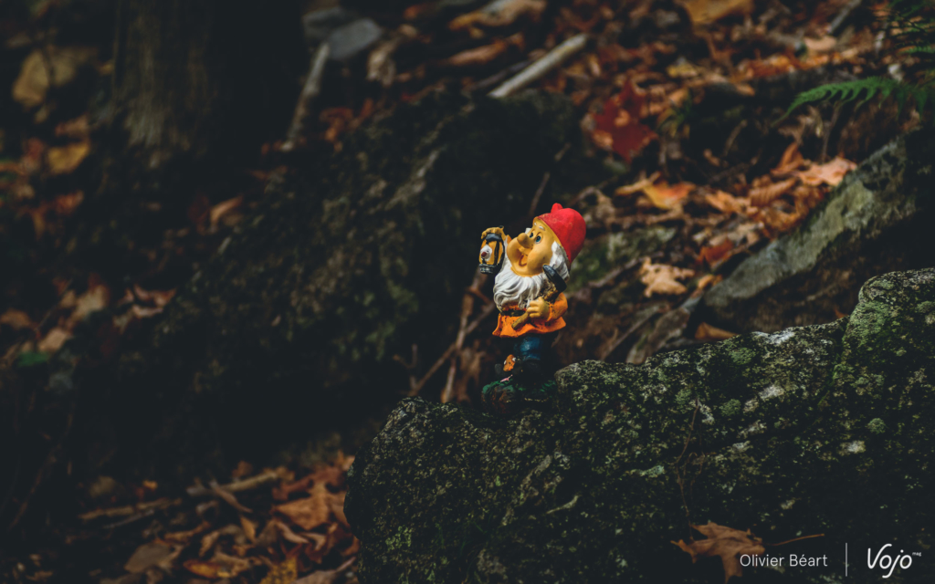 D’ailleurs, la magie de Bromont ne s’arrête pas là. Au détour d’un sentier, Emilie nous arrête et nous montre un petit panneau de bois, très discret, portant l’inscription « Hummus », le nom du trail. « C’est une des premières que j’ai faites. Maintenant, il y en a sur presque tous les sentiers. Et certaines, comme sur la Mordor, sont beaucoup plus travaillées. » En étant attentifs, on remarque aussi que toute une série de petits objets sont posés ça et là sur les bords du sentiers, posés tels des offrandes par des riders anonymes désireux de montrer leur reconnaissance aux créateurs des sentiers par ces petits clins d’oeil.