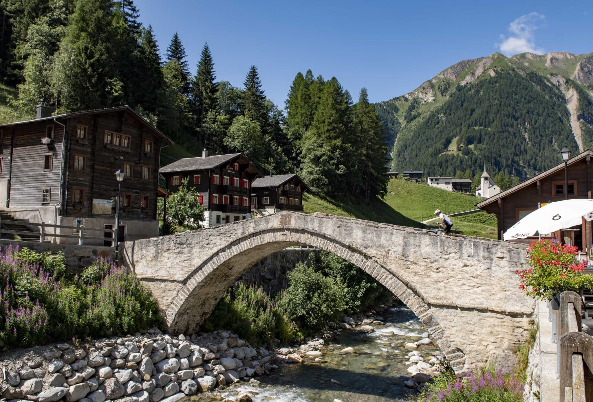 Depuis le village, nous franchissons le pont en pierre qui s’intègre parfaitement à l’arrière-plan des maisons en pans de bois : en route pour cette étape reine qui va passer par le col de Saflisch, situé à 2563 mètres d’altitude.