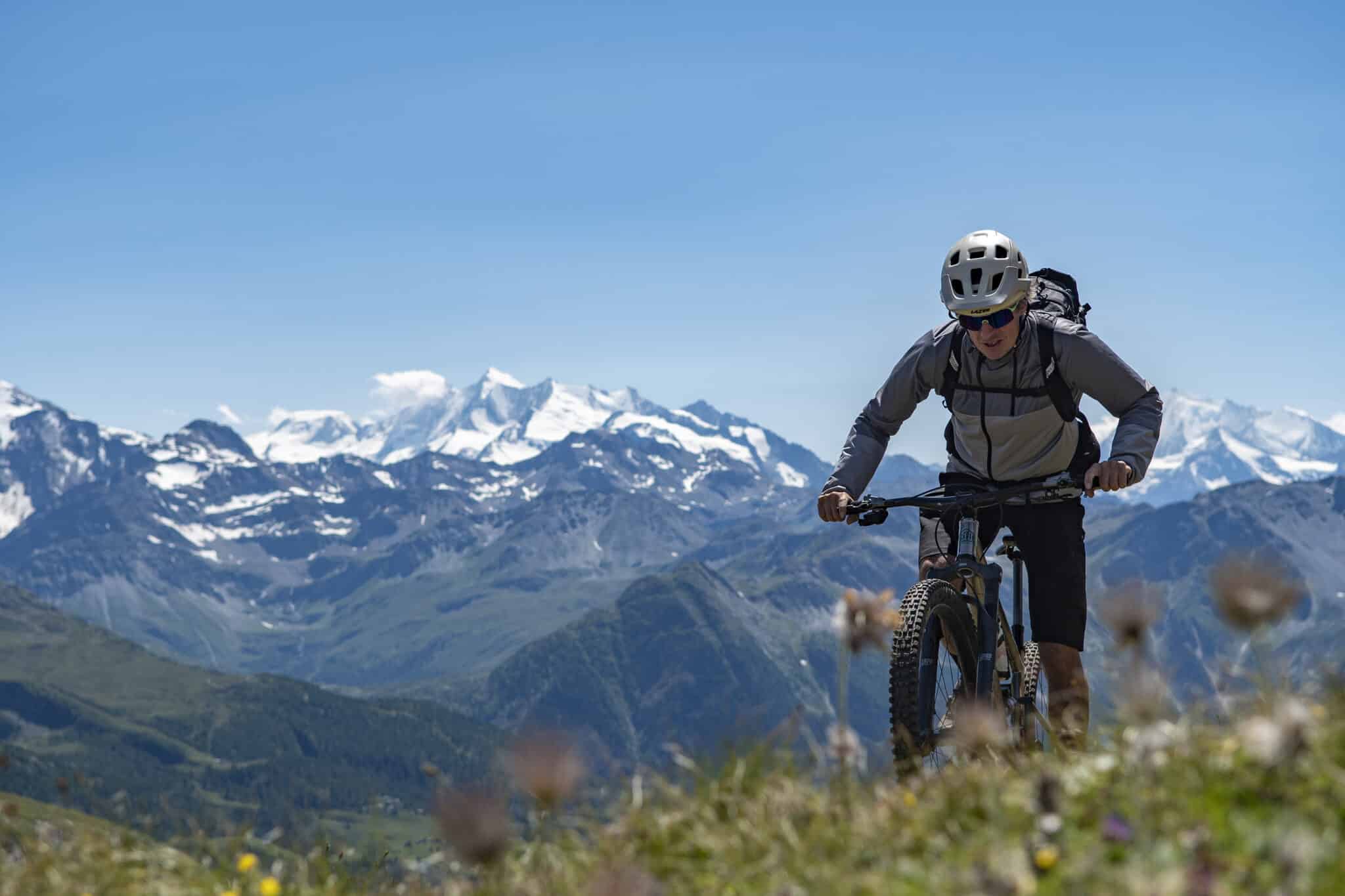 Au fil de la montée, la piste carrossable devient ténue. A l’entame du col, les lacets du sentier sinuent dans l’alpage et nous permettent de rester sur le vélo. Le versant ensoleillé donne envie de s’arrêter, de profiter du panorama qui se présente face à nous où émergent les 4 000 m du Valais et de l’Oberland. Un virage à droite, et nous piquons cette fois via un chemin bien caillouteux vers le village panoramique de Ried.