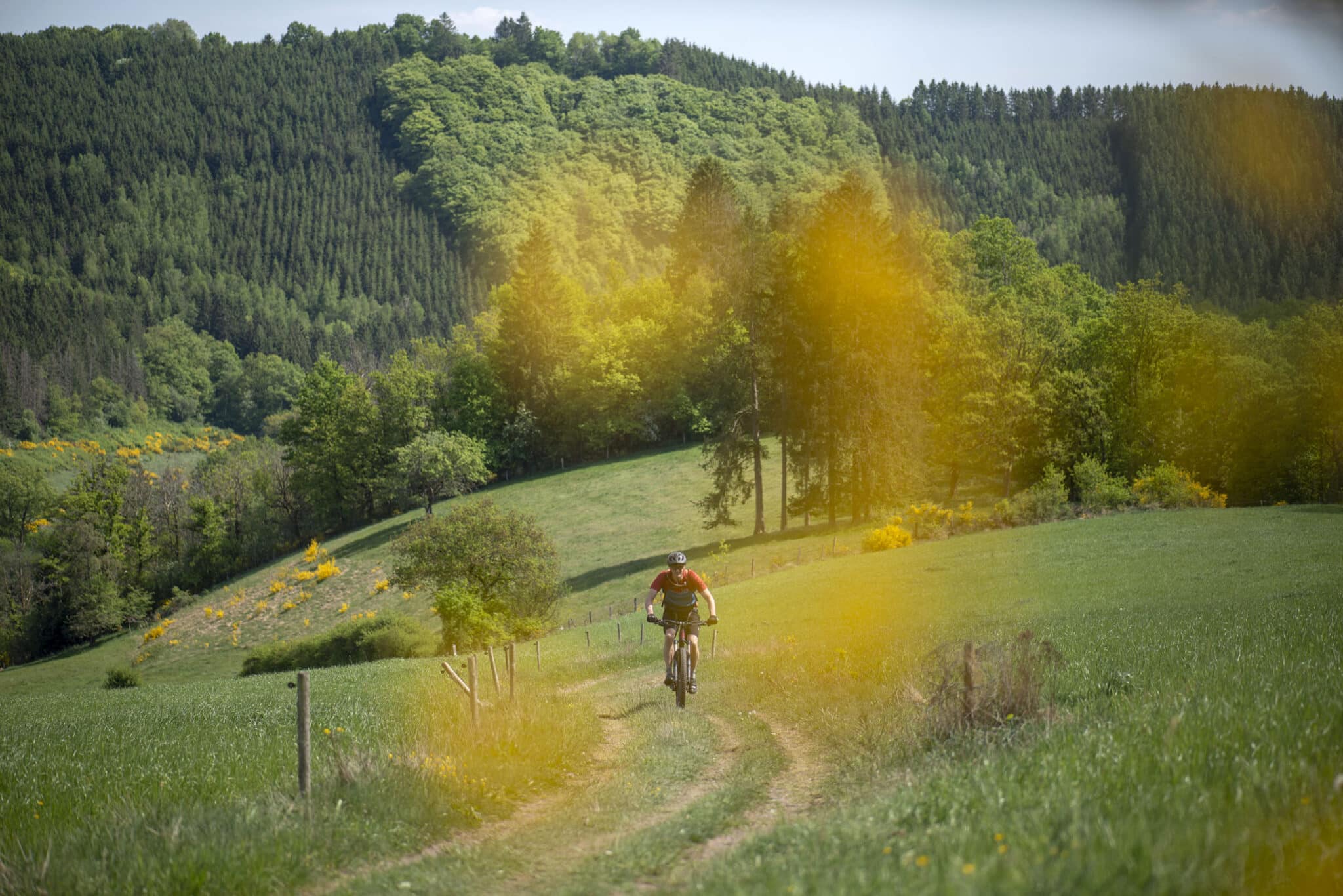 Nous voici sur une prairie non fauchée, dominant le village. Le soleil de cette fin de journée éclaire Burg-Reuland et révèle le paysage merveilleux de ce coin d’Ardenne peu connu, lieu de joie pour tous les amoureux de la randonnée à VTT.