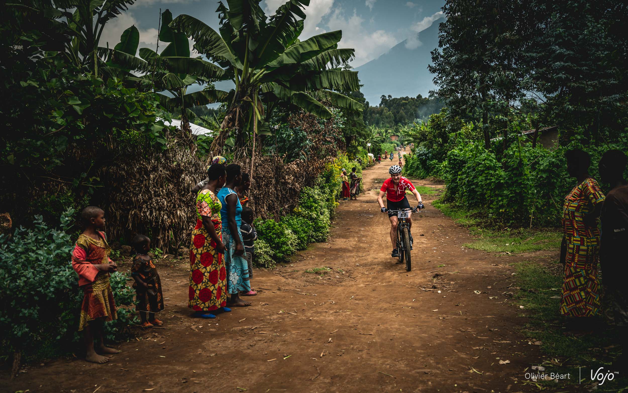 On l’a dit, le parcours a été tracé sous forme d’une longue boucle de 13km au pied des volcans. Pas de dénivelé impressionnant au programme ici car on reste dans les plaines d’altitude, qu’on appelle aussi le potager du Rwanda, mais on a ici une succession de chemins cassants qui imposent d’être toujours actif sur le vélo et très attentif pour ne pas se faire surprendre.