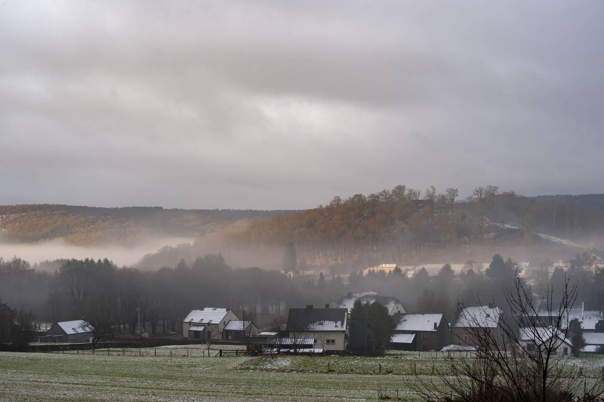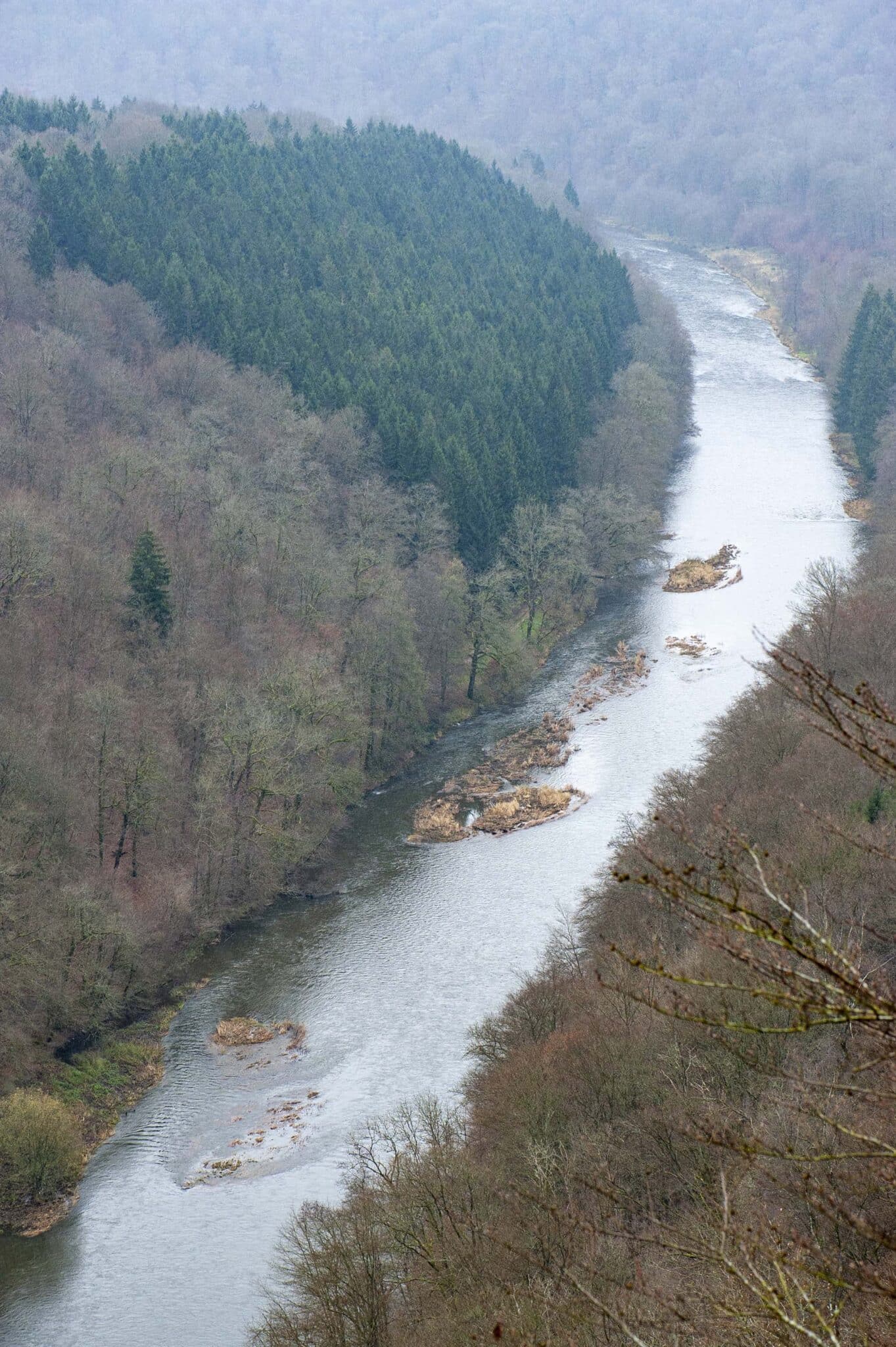 L’Ardenne et ses grandes forêts nous enveloppent peu à peu : le prochain village est distant de plus de 10 kilomètres. Si le givre n’a pas blanchi les rives, il a toutefois saupoudré les sommets des arbres comme une délicate dentelle.