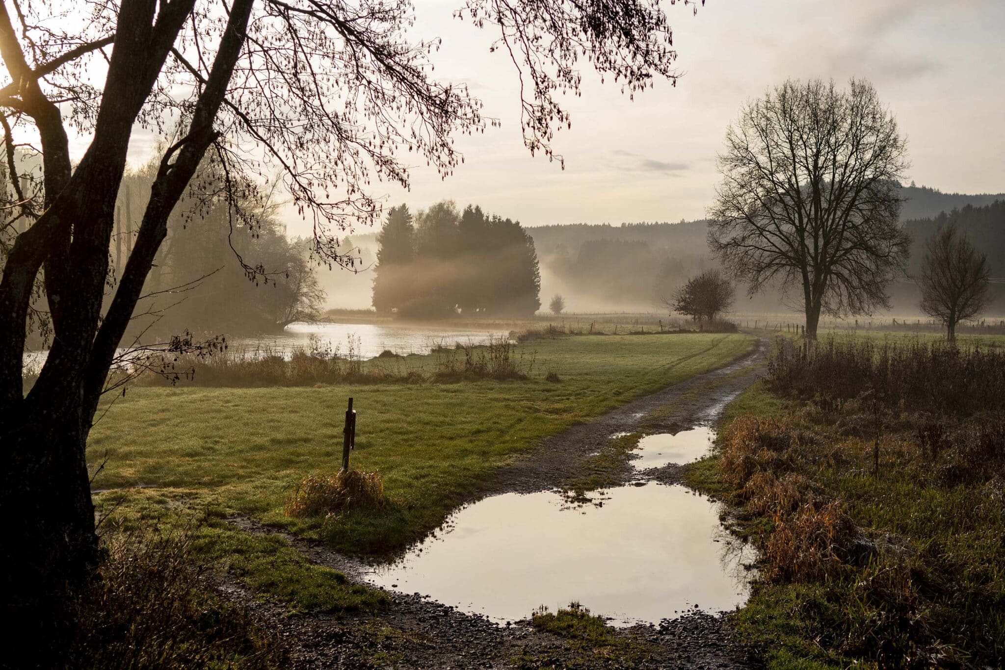 Avant d’y accéder, une longue descente nous mène sur les rives de la Semois. Le chemin longeant la rivière est un émerveillement. Les rayons pâles du soleil et la brume se levant dessinent des ombres fantasmagoriques.
