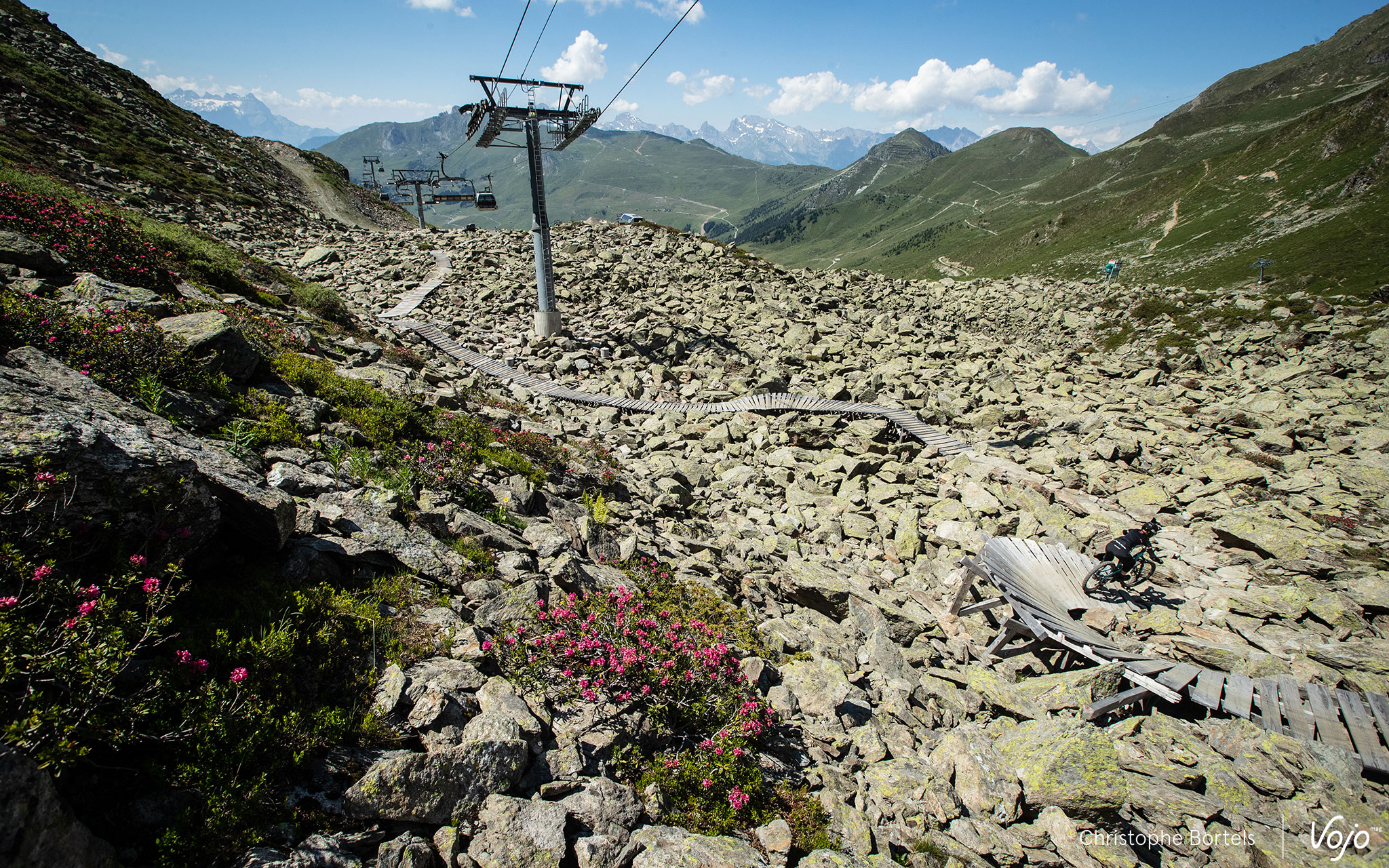 Après avoir emprunté la télécabine du Châble et celle des Ruinettes, le télésiège qui mène à Fontanet offre une vue imprenable sur les passerelles de la Bortabitche, une rouge de DH.