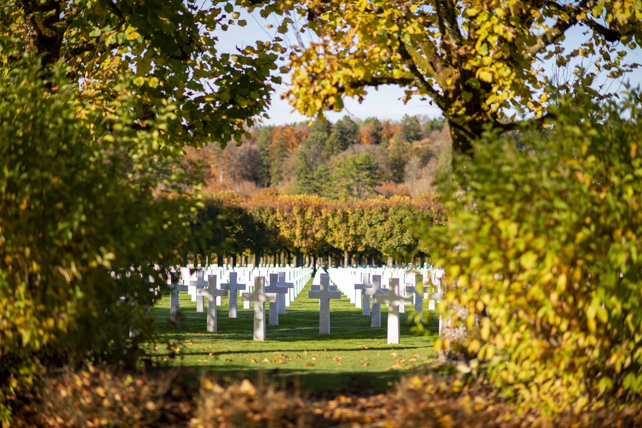La venue des troupes américaines au cours de la Première guerre mondiale a permis de délivrer l’Argonne, mais de nombreux soldats US trouvèrent la mort sur les champs de bataille argonnais : près de 15.000 soldats reposent dans le cimetière de Romagne sous Montfaucon. Nous nous laissons glisser en suivant les courbes du chemin blanc et crayeux. Avec douceur, il entame sa descente vers Varennes-en-Argonne.