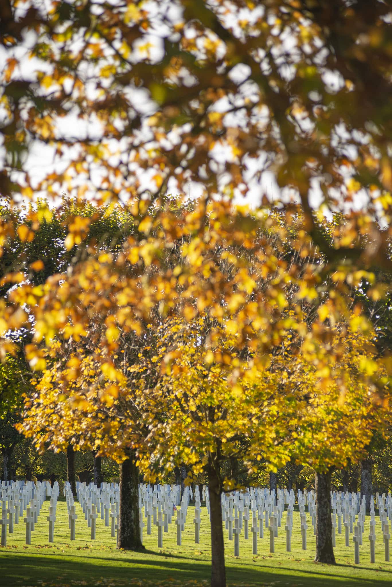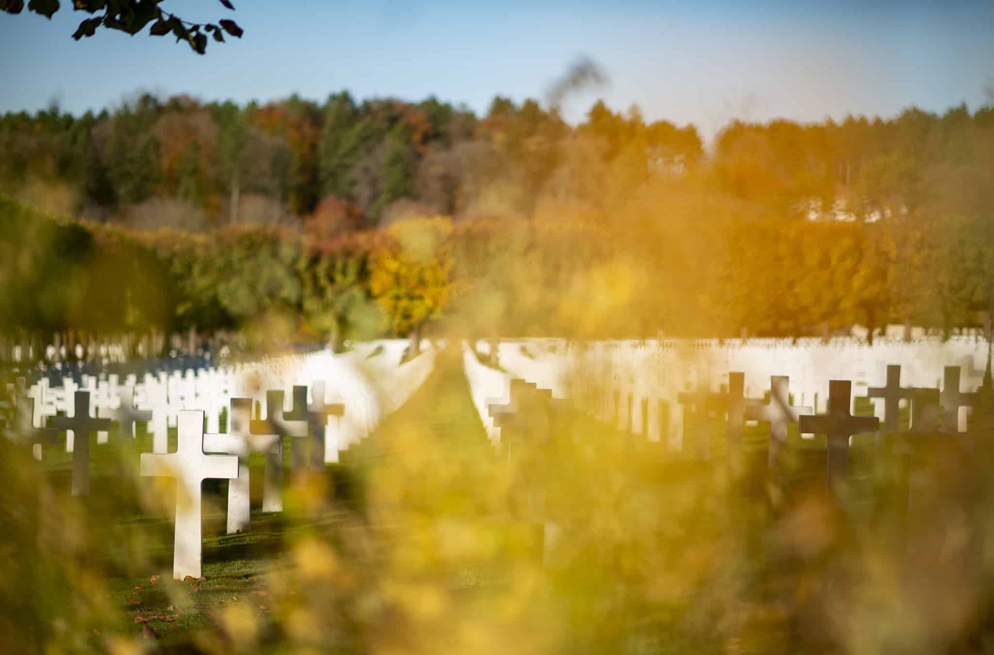 La venue des troupes américaines au cours de la Première guerre mondiale a permis de délivrer l’Argonne, mais de nombreux soldats US trouvèrent la mort sur les champs de bataille argonnais : près de 15.000 soldats reposent dans le cimetière de Romagne sous Montfaucon. Nous nous laissons glisser en suivant les courbes du chemin blanc et crayeux. Avec douceur, il entame sa descente vers Varennes-en-Argonne.