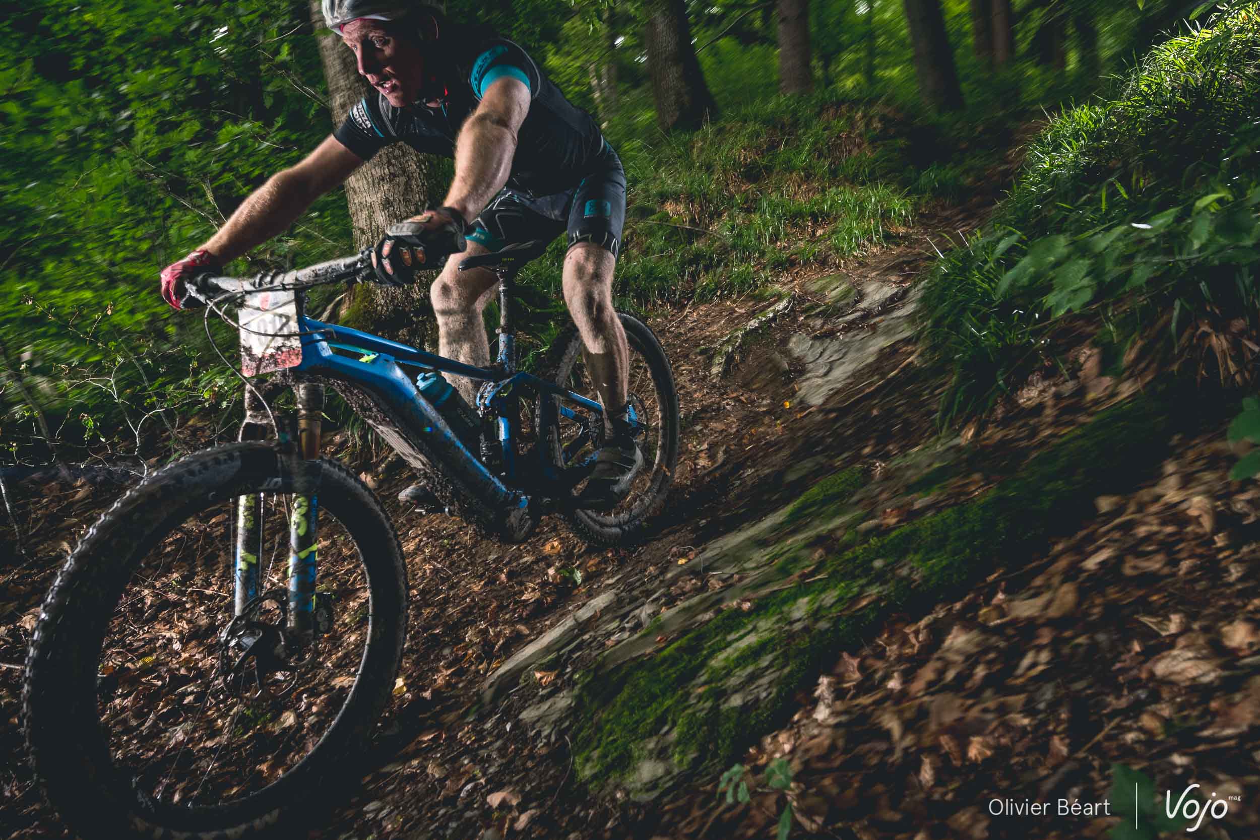 Grégory Burtombois n’est pas un parfait inconnu, puisqu’il est l’organisateur et traceur de l’enduro de la Lesse à Daverdisse. Mais la pratique de Greg ne se limite pas à l’enduro et vous le verrez aussi sur des raids multi-sports ou des triathlons où il excelle bien souvent. Autant dire que, physiquement, le gaillard a des ressources. Et pourtant, une des premières choses qui l’ont marqué, c’est la difficulté physique quand on décide d’ouvrir en grand : “Je me suis pris au jeu et j’ai voulu faire la course en tête… mais c’est vraiment extrême niveau intensité ! Comme le moteur ne pousse que jusque 25km/h, si on veut aller au-delà, il faut pousser fort car le vélo est très lourd. C’est comme faire une course avec le vélo de 16kg que j’avais reçu à Noël quand j’avais 12 ans !”