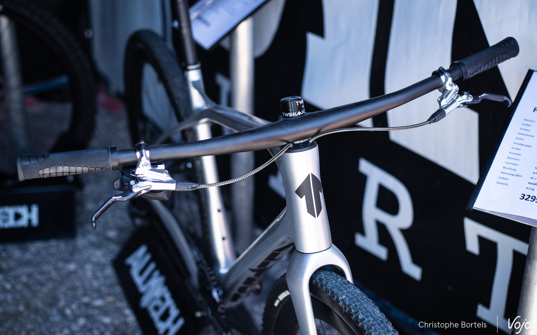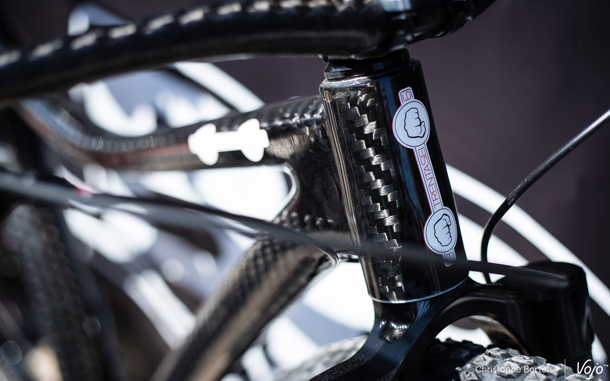 Dans le même stand, on retrouvait aussi Trentasei, et pour cause : Bright leur fournit des fourches sur mesure, puisque l’entreprise (dont le nom signifie trente-six en italien) produit des vélos avec roues de… 36″ ! Du coup, il fallait bien trouver des fournisseurs de jantes, pneus et fourches pour ces roues hors normes. Leur modèle se décline en carbone ou en titane et devrait être disponible à l’achat à la fin du mois de mai. Petit exploit : Trentasei est parvenu à conserver l’empattement d’un 29″ traditionnel.