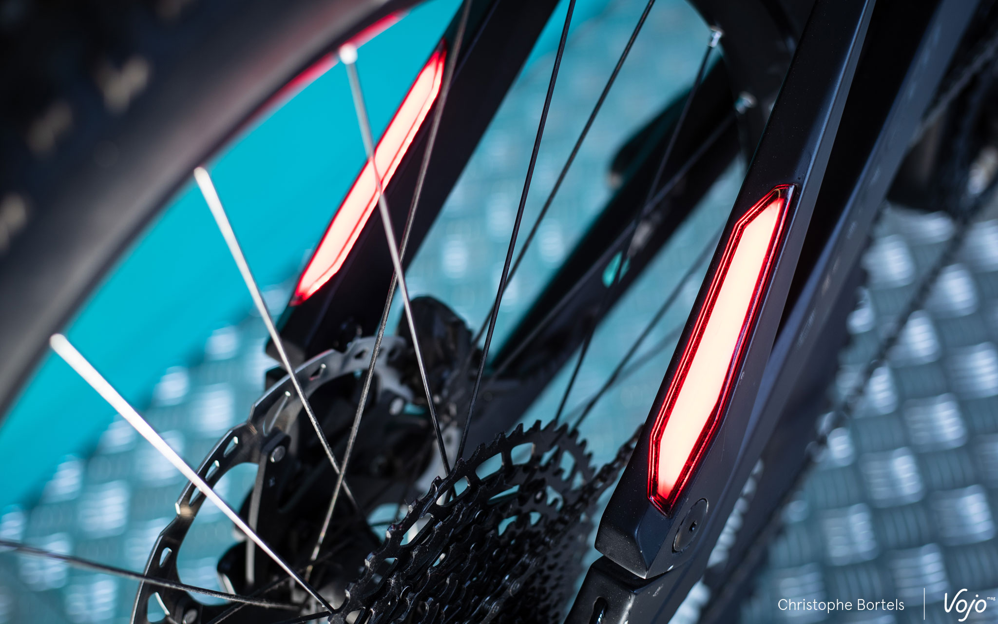 Egalement sur le stand Rotwild, on retrouvait ce cadre généreusement découpé en plusieurs endroits, ce qui est toujours très instructif pour apprécier l’intégration de la batterie, du moteur, des câbles, etc.