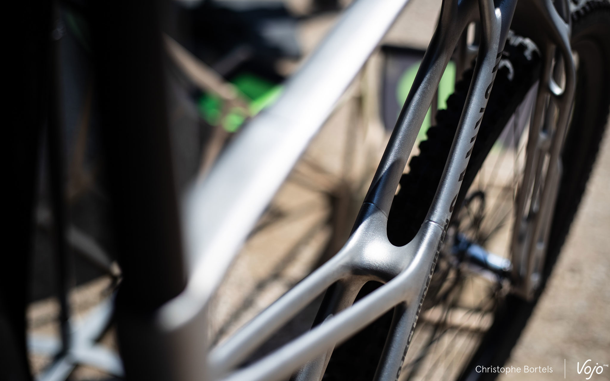 Toujours chez Titici, retour à la normale ou presque grâce au All-in, leur nouveau vélo de gravel. Outre l’intégration des câbles et gaines, un gros travail a été effectué au niveau de la finition, anodisée et non peinte. Résultat, la marque annonce une résistance remarquable aux griffes et à l’usure et un nettoyage facilité puisque les crasses ne peuvent quasiment pas rester collées au cadre.