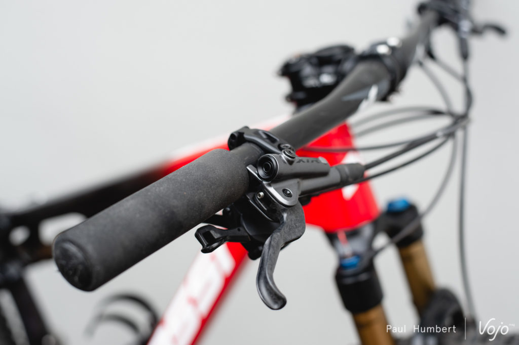 On remarque avec une certaine surprise que peu de périphériques sont en carbone puisque seul le cintre, en 720 mm, fait appel à ce matériau. La potence (en 80 mm) et la tige de selle sont en aluminium tandis que la selle utilise des rails en titane. Un peu plus de poids, notamment sur la selle et la tige de selle mais aussi une bien meilleure fiabilité en cas de chute.