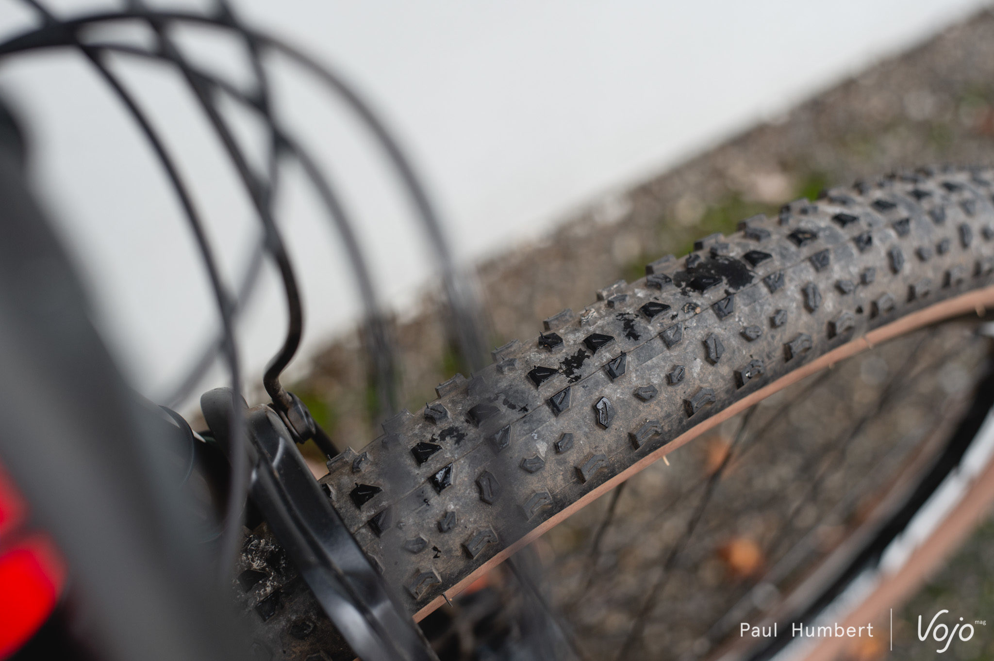 Côté roues, c’est un montage réalisé à partir de jantes Massi Replica Graphene (en carbone), de moyeux Massi et de 28 rayons, ligaturés par 2 de chaque côté. Les pneus sont également des Massi, montés en tubeless et en section de 2,20. L’équipe utilise principalement deux modèles qu’on qualifiera « d’intermédiaires », le Rader Pro et le Storm Pro.