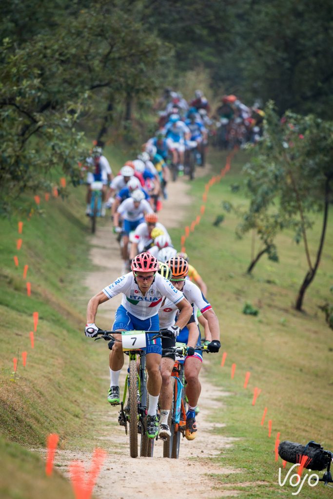 La course part vite, les athlètes roulent fort. Il n’y a que trois médailles à la clé et il faut sauter dans le bon wagon ou être sa propre locomotive. Un groupe de tête se forme très rapidement. On y retrouve Marco Aurelio Fontana, Nino Schurter, Victor Koretzky et Peter Sagan ! Juste derrière, les groupes bougent et se mettent en position.