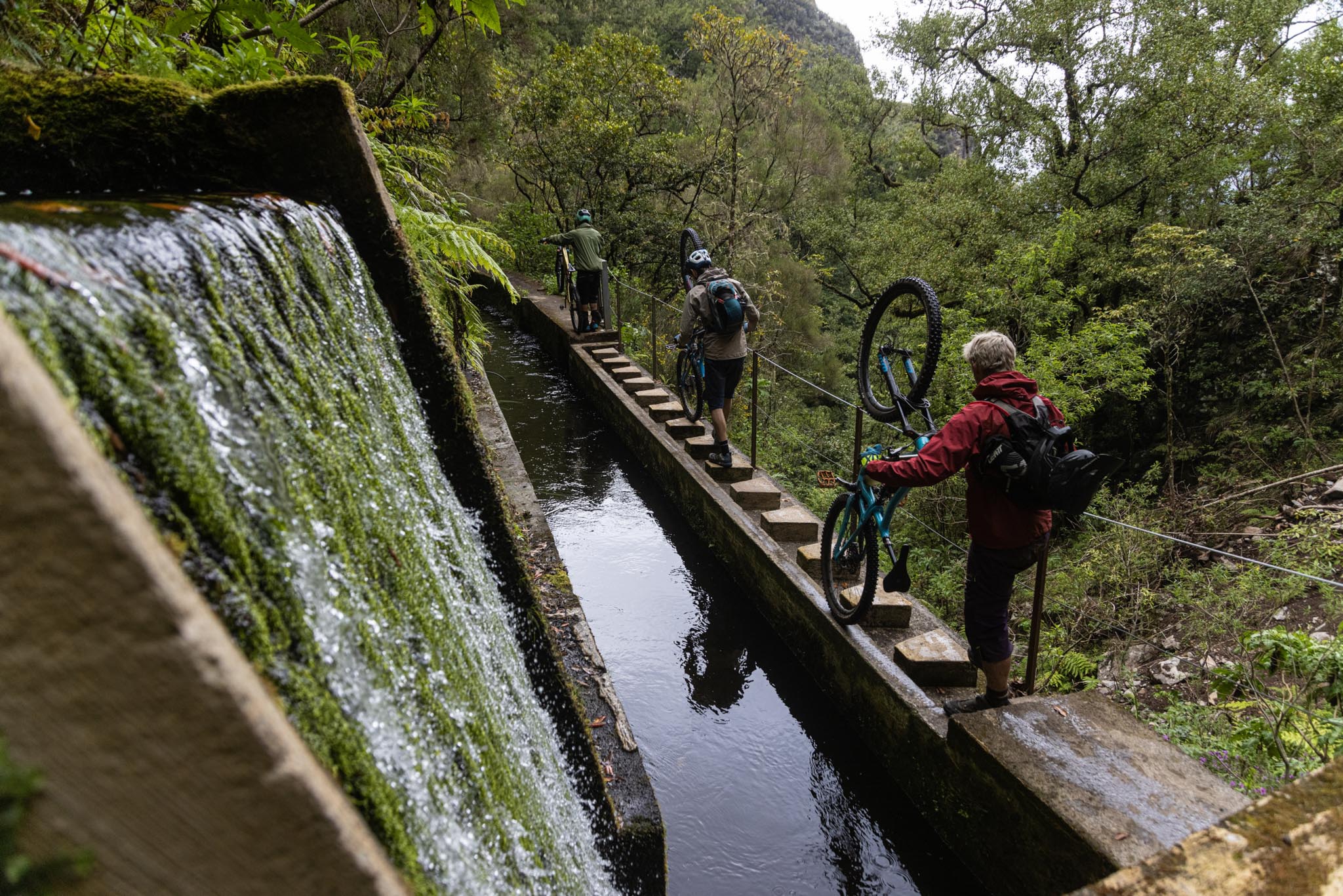 Parmi les riders, bien peu sont confiants avant d’affronter la tristement célèbre « glace noire » de Madère. Finalement, la pluie est si forte que nous ne l’affronterons pas vraiment aujourd’hui. La boue est tellement liquide que les pneus restent propres et c’est en fait assez fun à rouler ! La seule chose vraiment traître, c’est le « Serpent brun », autrement dit les racines !