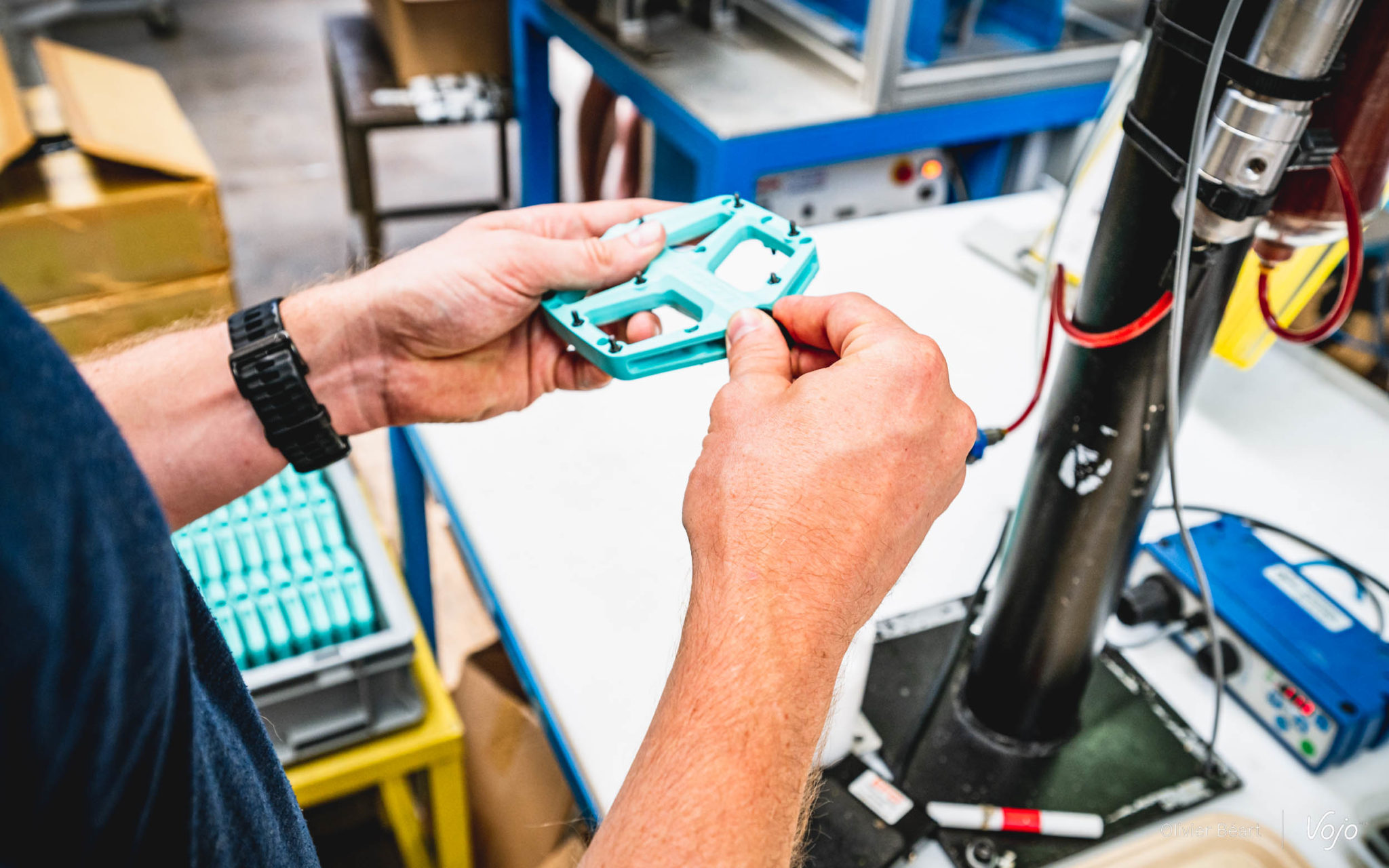 Une fois les présentations faites, toute l’équipe me regarde avec un petit sourire : « Si tu veux repartir avec une paire de pédales pour les tester, il va falloir les produire toi-même ! » Allez, d’accord, challenge accepté.
