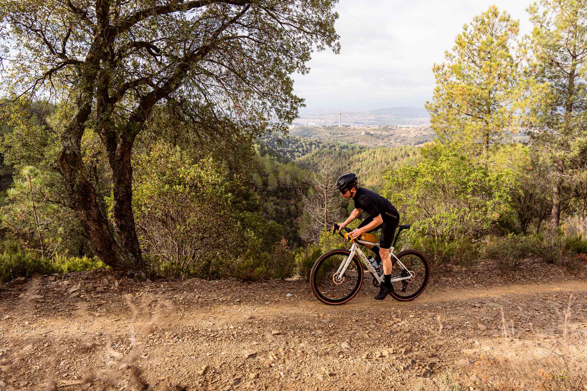 On s’échappe très vite du centre-ville et on accède vite à de grandes pistes à travers champs, ou des itinéraires plus vallonnées dans les massifs qui jouxtent le ville. Un des points névralgiques des pratiques routes et gravel, c’est le col d’Els Angels où de grandes pistes et une superbe route se croisent, avant de redescendre sur des petits villages iconiques de la région.