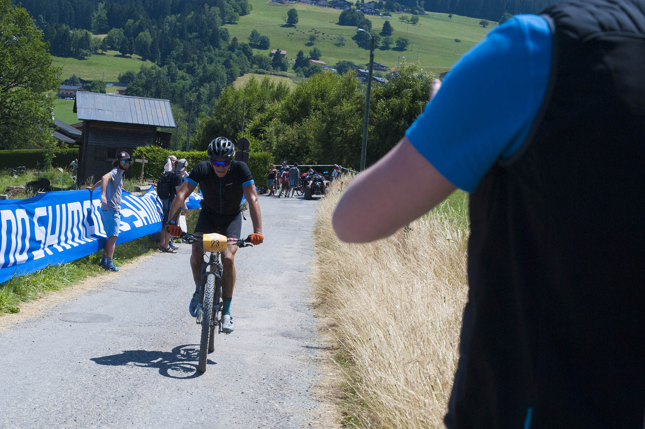 Alors qu’il avait brillamment passé l’Ultra Climb en selle, Gauthier semble aussi buter contre le mur des 100 kilomètres qui se présente à Combloux. Le pilote BMC a les traits marqués, il avoue ne plus bien savoir pourquoi il continue.