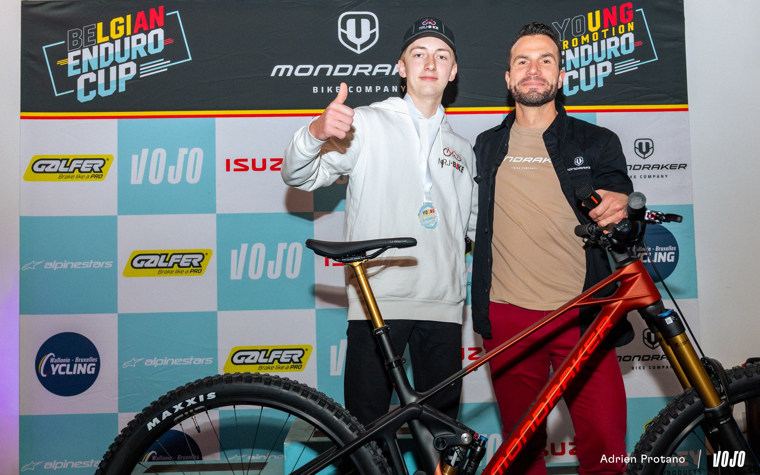 Pour encourager la relève et valoriser ses meilleurs jeunes pilotes, la Youth Promotion Enduro Cup avait mis en jeu un prix spécial : un Mondraker Foxy prêté au vainqueur du classement scratch pour la saison suivante, un geste rendu possible grâce au partenariat avec Mondraker. C’est Marc Lancelot, responsable marketing de la marque France/Benelux qui se charge de remettre le vélo au gagnant de cette année, Roman Destexhe.