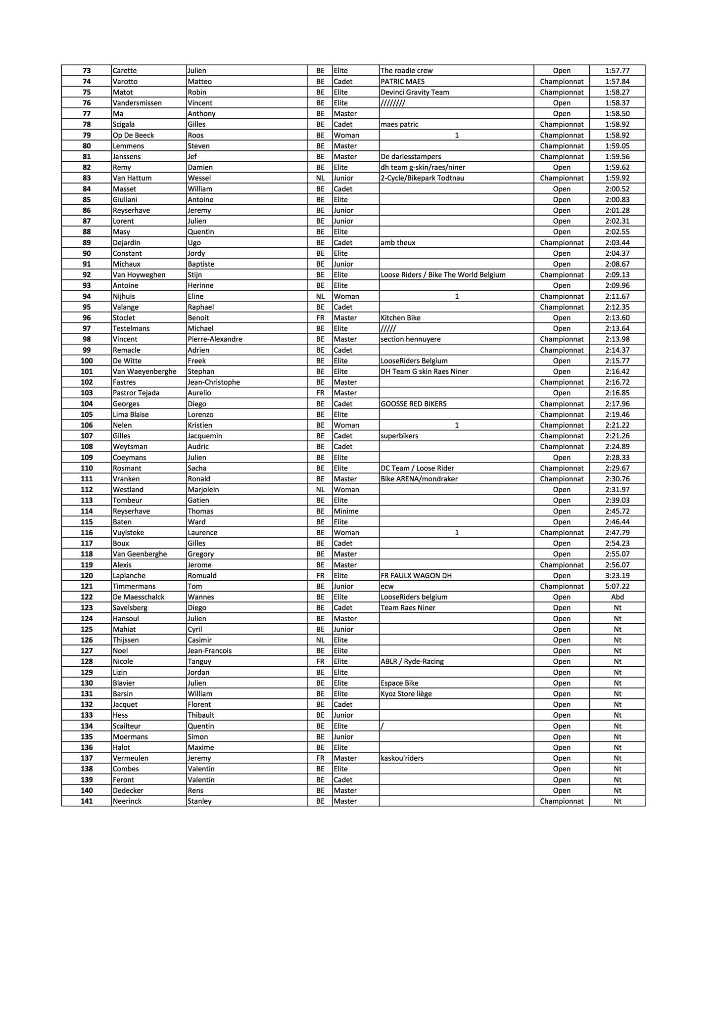 Troisième des cinq manches de la DH1, la coupe de Belgique de descente, Maboge faisait également office de championnat de Belgique et des Pays-Bas. Alors que Nicolas Mathieu avait été sacré à Vielsalm l’année dernière, c’est cette fois Grégoire Pazdziorko qui s’est emparé du maillot noir-jaune-rouge tant convoité. Voici les photos et les résultats complets de la course :