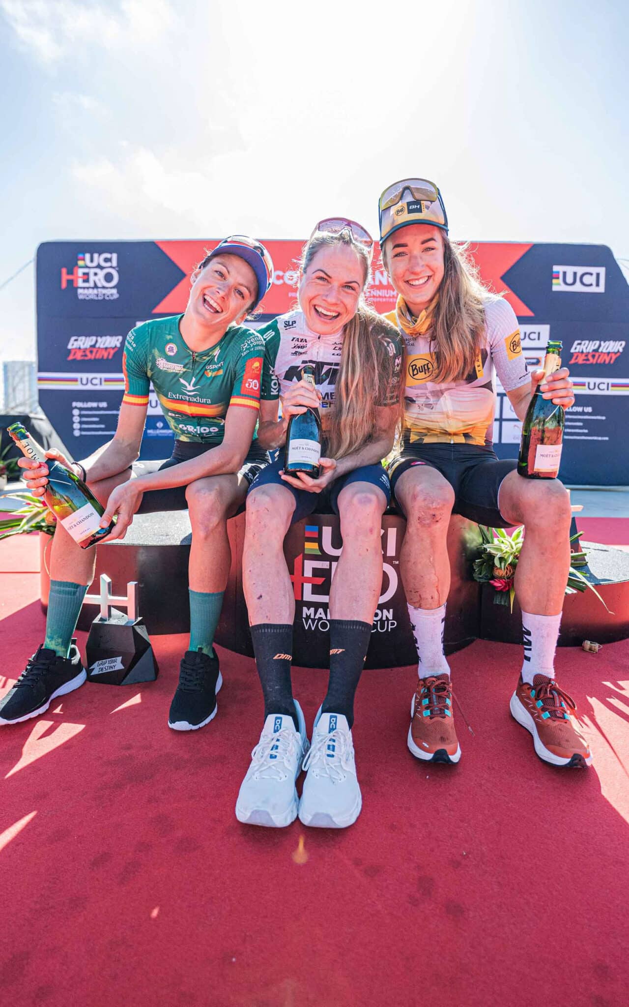 Derrière elle, la lutte pour le podium a animé la course. L’Espagnole Natalia Fischer s’empare de la deuxième place, tandis que Rosa van Doorn, vainqueure finale de la Coupe du monde XCM 2025, complète le podium. La Polonaise Paula Gorycka échoue au pied de la boîte.