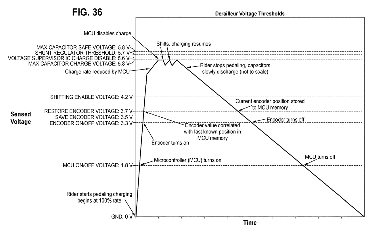 Charger le dérailleur… mais pas que ? « Il faut comprendre que le dispositif de stockage peut alimenter d’autres dispositifs et accessoires électriques, y compris ceux situés à distance du dérailleur, par exemple et sans limitation un capteur de vitesse de roue, un capteur de vitesse de cassette, un compteur d’énergie, des lumières, le dérailleur avant, une tige de selle réglable, et/ou d’autres types d’accessoires de vélo, ou peut alimenter le moteur et de tels dispositifs auxiliaires » peut-on lire dans les dernières lignes de la description. Cela nécessiterait toutefois d’utiliser des câbles, à rebours de tout l’investissement de Sram pour les technologies sans fil.