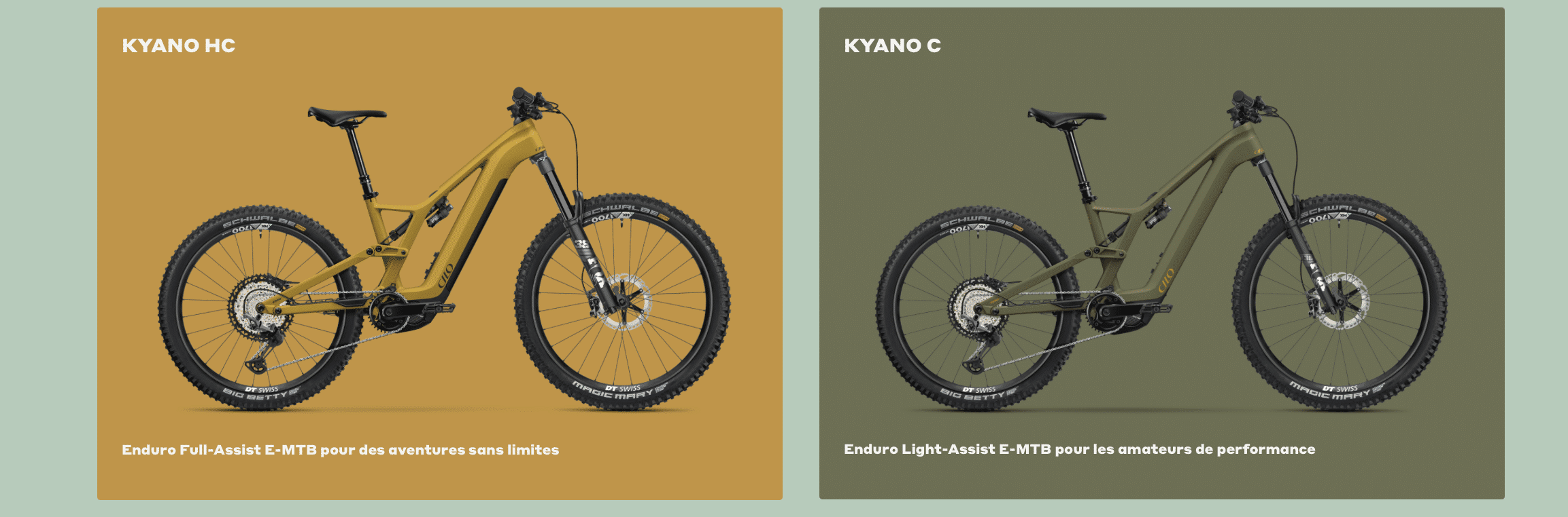 Le Kyano penche quant à lui clairement vers l’enduro, avec un débattement qui passe à 170 mm à l’avant et 160 mm à l’arrière.