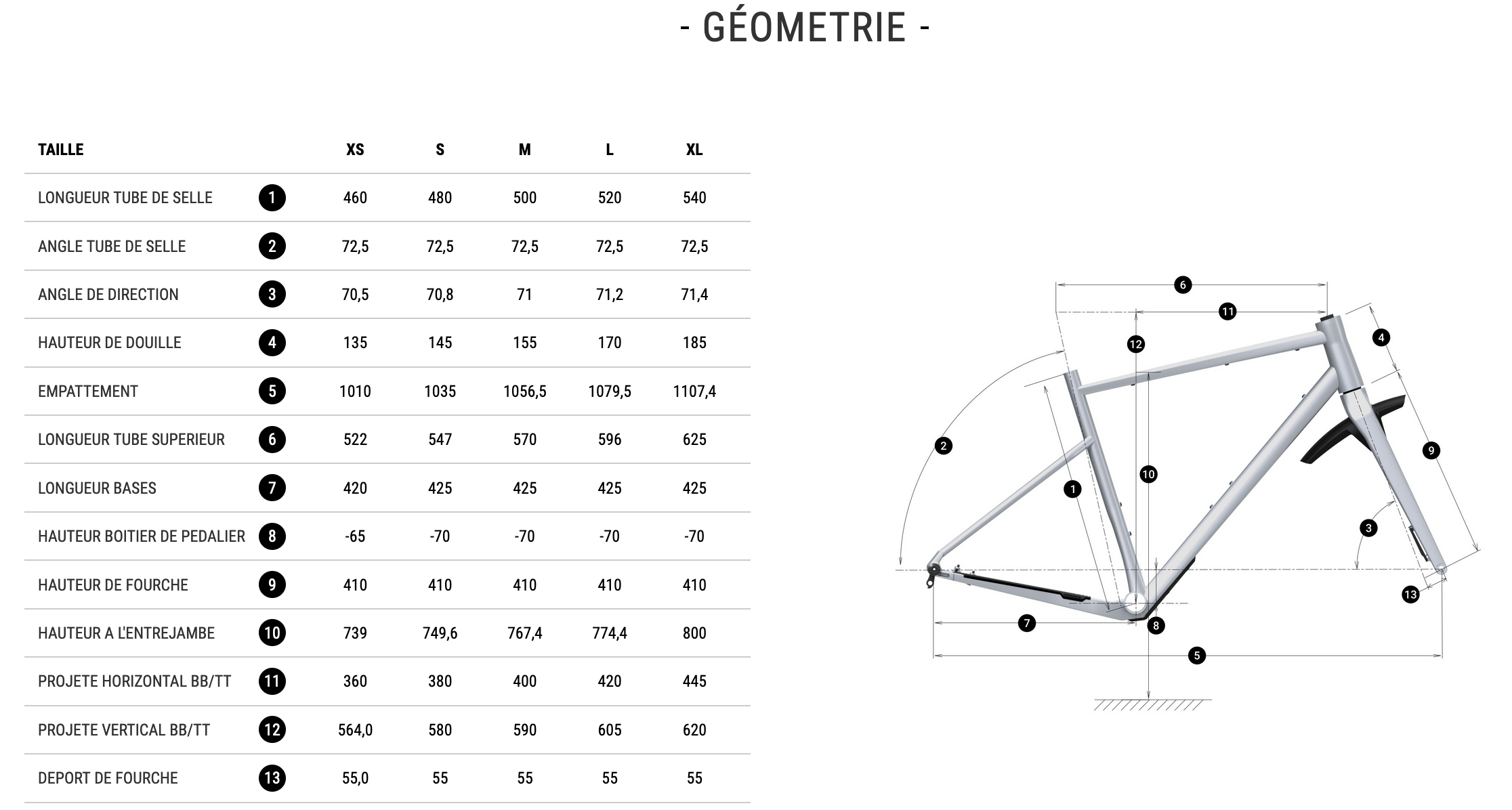 La géométrie est dans la même veine, avec un reach long (400 mm en taille M), un angle de direction entre 70,5° et 71,4° suivant la taille, des bases de 420 mm (XS) ou 425 mm (autres tailles) mais tout de même un stack bas (520 mm en taille M) pour garder un peu de sportivité. On remarque aussi un déport de fourche particulièrement long (55 mm) ce qui devrait donner une direction assez vive. Enfin, la potence est très courte pour un gravel (70 mm) et associée à un cintre plus large que de coutume (de 440 mm en XS/S à 480 mm en L/XL, 25° de flare).