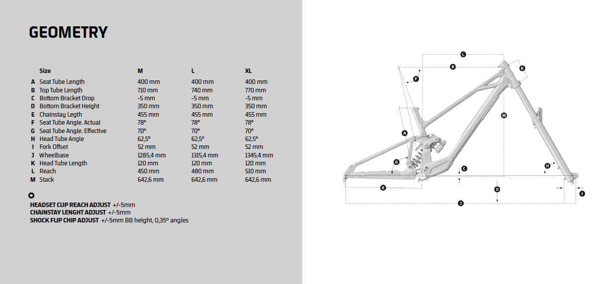 Mondraker conserve sa philosophie Forward Geometry, qui lui est chère mais avec une approche ici clairement optimisée DH : un angle de direction de 62,5°, des bases de 455 mm et un reach de 450, 480 et 510 mm en tailles M, L et XL.