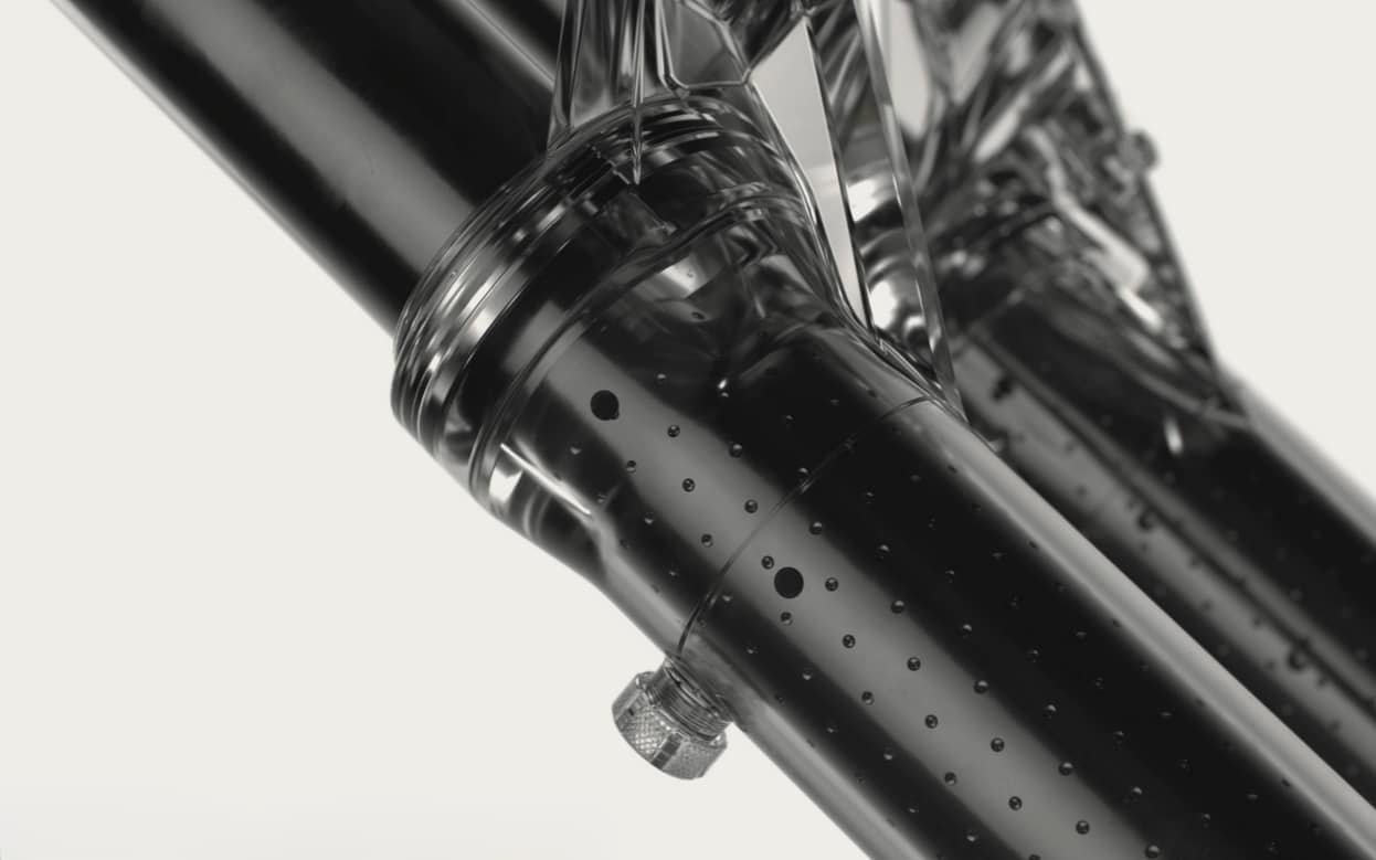 Dans les autres petits détails, les nouveaux plongeurs intègrent des orifices de respiration permettant d’équilibrer la pression interne des jambages. RockShox annonce que « cela réduit la force d’amorce et améliore la sensibilité en début de course ». Pour ce que ce soit bien plus clair, il s’agit là des deux plus gros orifices sur la gauche, les nombreux petits orifices sont le « ButterWagon ».