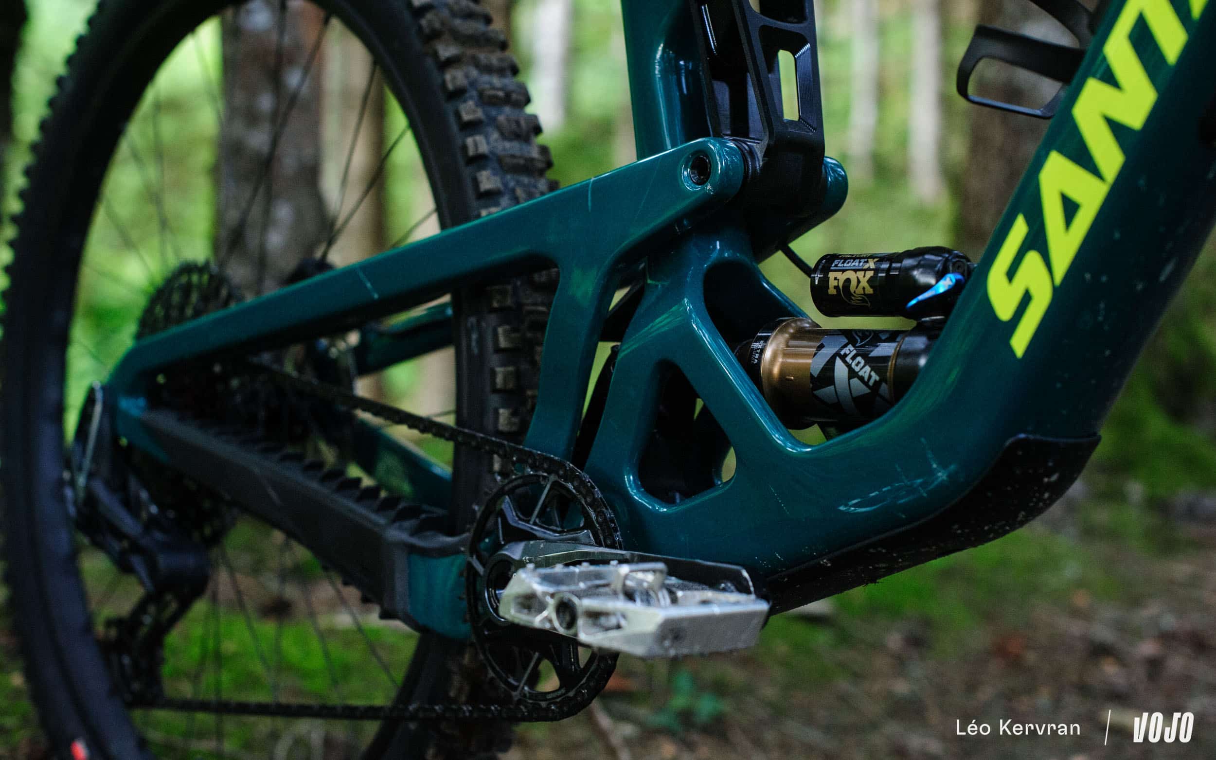 Pour Santa Cruz, dégager ainsi l’espace était nécessaire à son véritable objectif : réduire l’anti-squat du vélo, ce qui passe ici par un basculeur plus droit (et plus grand) que sur la génération précédente. Les valeurs restent supérieures à celles du nouveau Bronson, ce qui permet d’envisager un comportement plus dynamique au pédalage, mais on perd tout de même entre 10 et 15 % tout au long du débattement. Objectif annoncé, réduire le kick-back (intrinsèquement lié à l’anti-squat) lorsque la roue arrière rencontre un obstacle et proposer une suspension plus active au pédalage sur les terrains techniques.