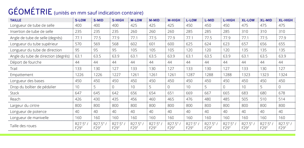 On retrouve des valeurs typiques des VTTAE d’enduro récents : en taille M (et position haute), on a un angle de direction de 63,5°, un tube de selle de 77,5°, un reach de 465 mm et des bases fixes de 450 mm.