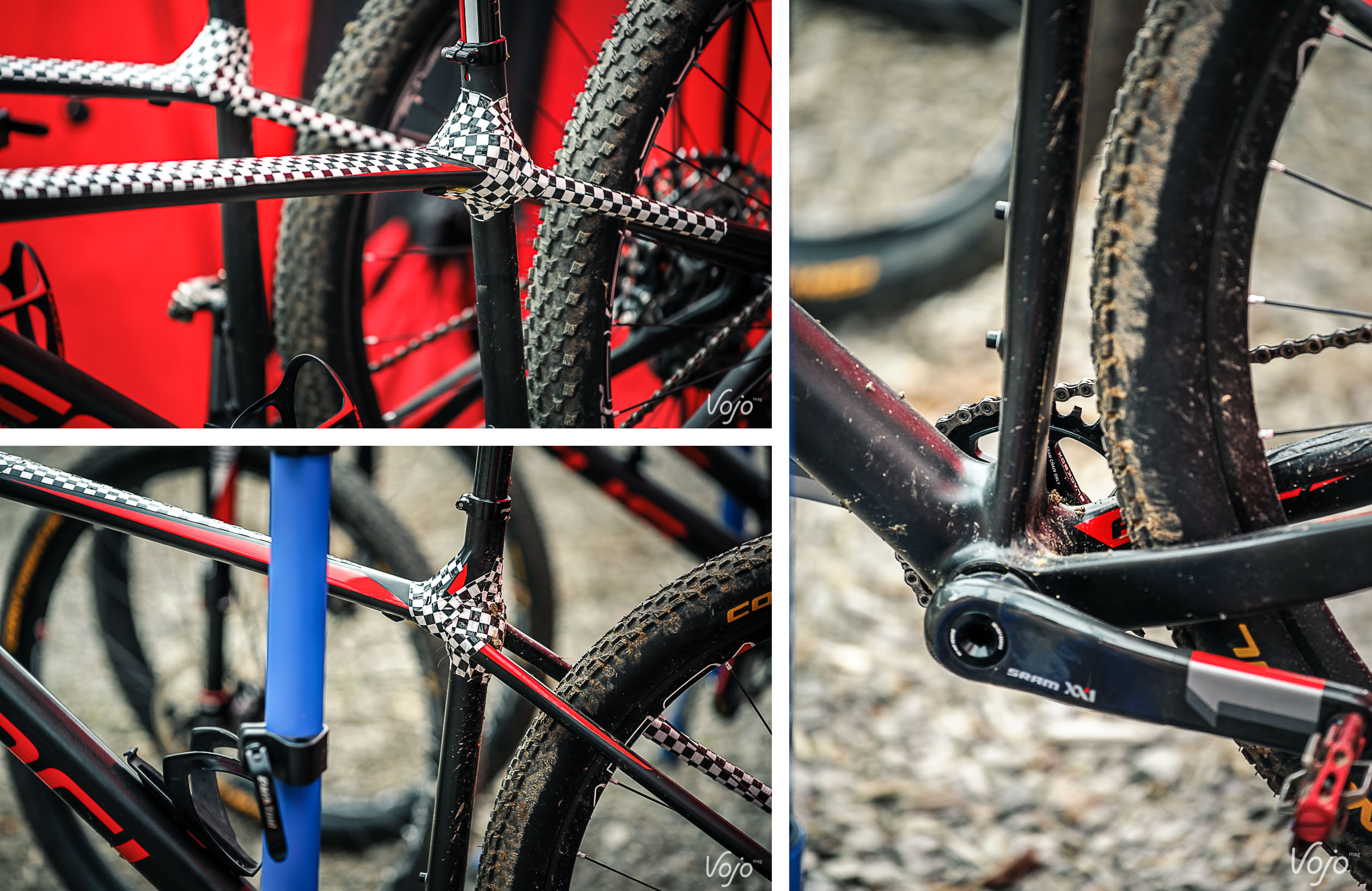 Mais ce qui intrigue le plus, c’est la présence massive de tape de camouflage sur le haut du tube de selle. Ce n’est pas un serrage intégré de la tige de selle, puisqu’on note la présence d’un collier sur le haut.