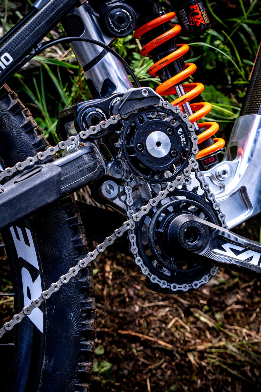 Quel est l’intérêt d’une telle solution ? Plusieurs marques ont décidé de doter leur modèle DH d’une roulette afin de réduire l’effet de kickback (cf. lexique), à l’image du Norco Range, du Commencal Suprême V5, du Trek Session… La limite de cette solution est le mauvais enroulement que celle-ci présente, plus précisément le fait que la chaîne ne fasse contact qu’avec peu de dents de cette roulette, ce qui entraîne un mauvais transfert de la puissance et une usure concentrée sur peu de dents. En optant pour une double chaîne, Pivot permet de s’approcher d’une meilleure répartition de l’usure, mais également d’un meilleur roulement, le tout avec une chaîne qui remonte assez près du point de pivot.