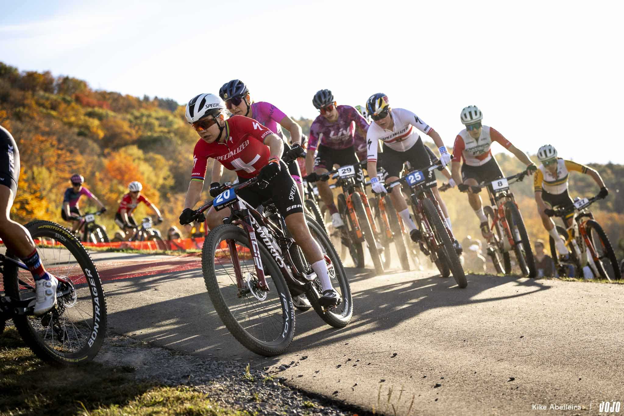 Le peloton est très compact sur ce XCC, un scénario de course assez habituel pour ces épreuves qui durent environ 20 minutes et où les athlètes attendent généralement les derniers tours pour lancer une attaque. Stratégie de course avant tout ! À l’avant de ce groupe de pilotes, c’est Jenny Rissveds, Evie Richards et Alessandra Keller (vêtue de son joli nouveau maillot de championne du monde) qui contrôlent la course.