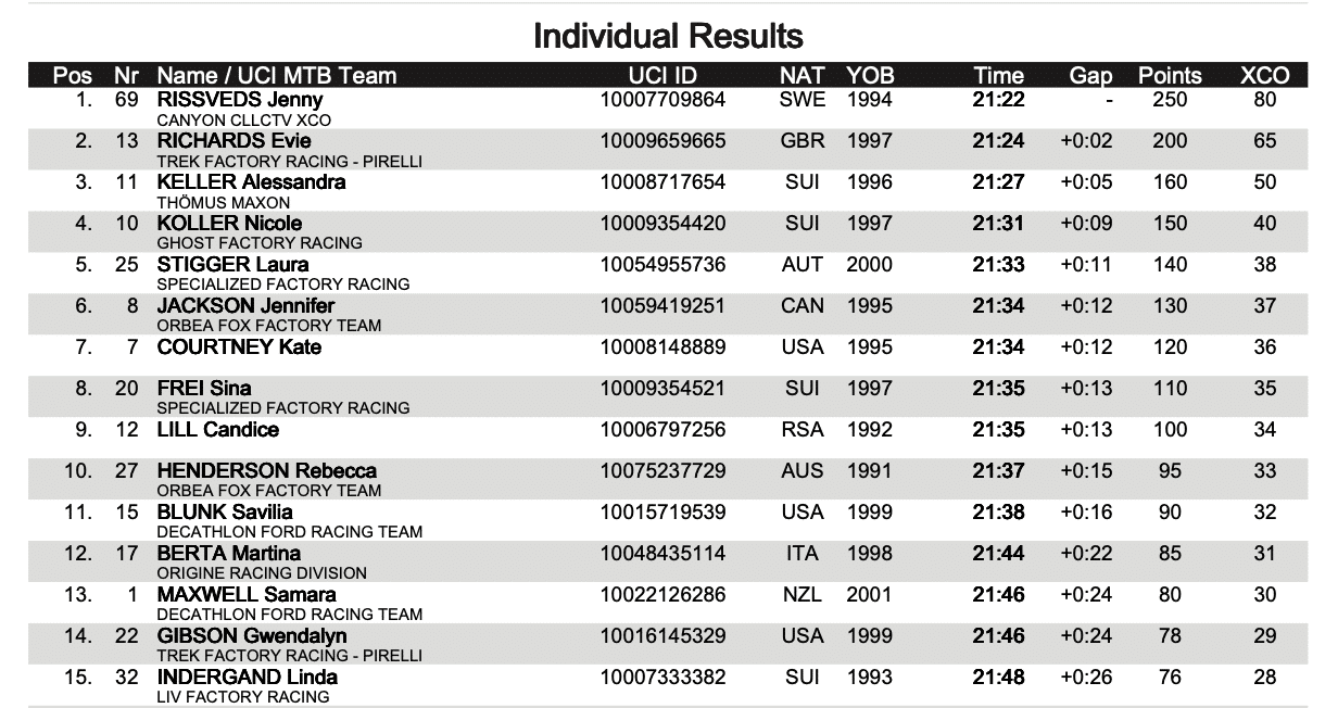Le top 10 est complété par Jennifer Jackson (6e), Kate Courtney (7e), Sina Frei (8e), Candice Lill (9e) et Rebecca Henderson (10e). On notera la 13e place de Samara Maxwell qui a fait un impressionnant retour après sa chute en début de course.