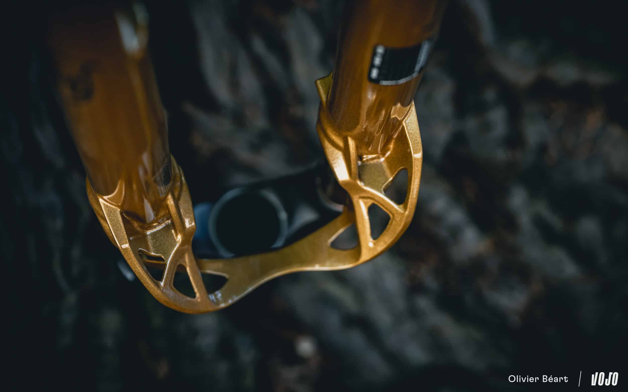 Dans son objectif de traquer le moindre gramme superflu sans compromettre le comportement de la fourche, Fox s’est penché sur chaque partie de la fourche. Par exemple, le pivot a été allégé de 11 g, et le té voit sa forme encore plus travaillée pour gratter 9 g supplémentaires.