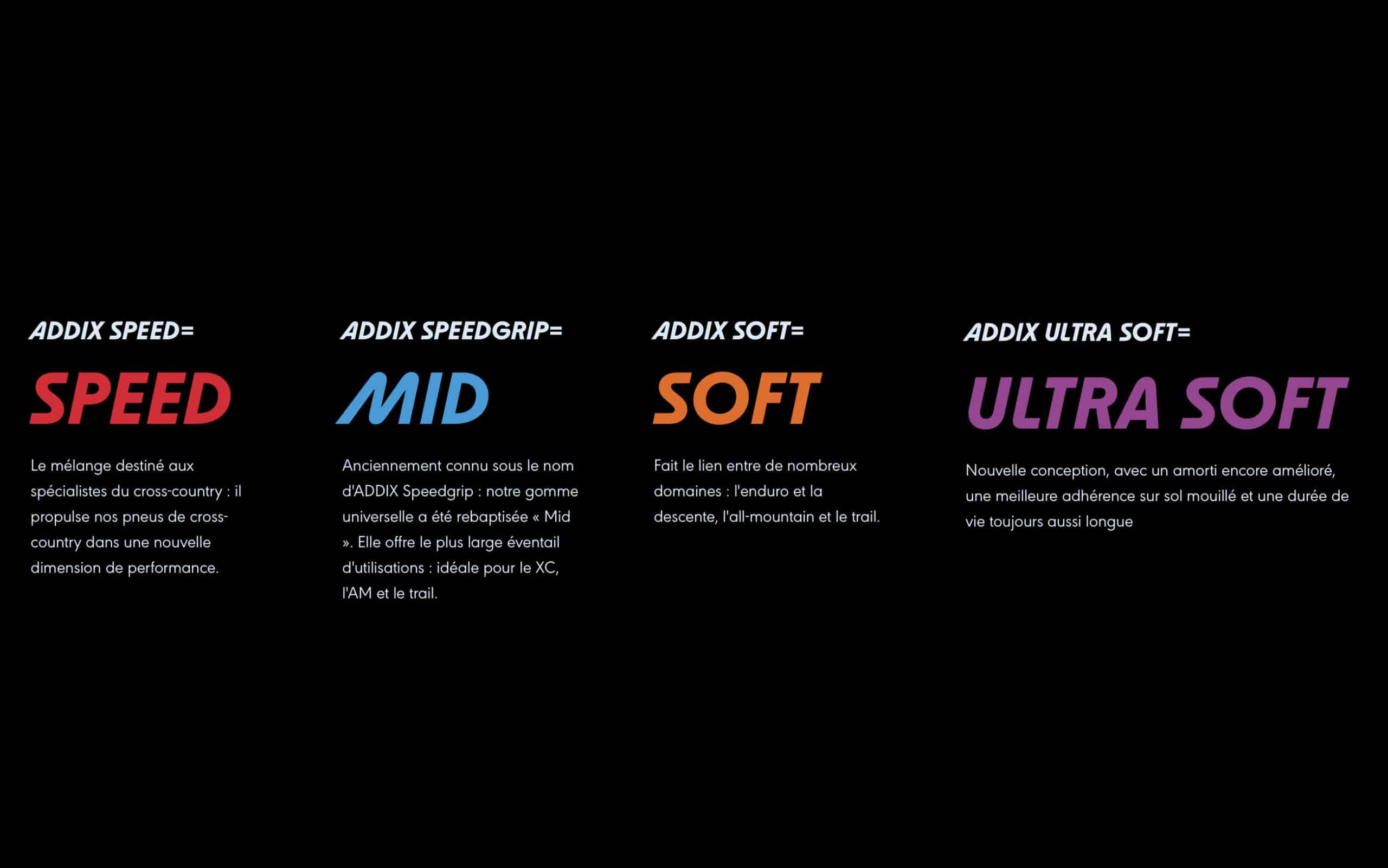 Schwalbe maintient ses codes couleur sous forme d’une ligne qui court sur toute la circonférence de la bande de roulement, mais la marque a décidé de ne plus utiliser le terme « Addix » pour ses gommes. Elle se contente désormais des termes Speed (rouge), Mid (bleu), Soft (orange) et Ultra Soft (mauve).