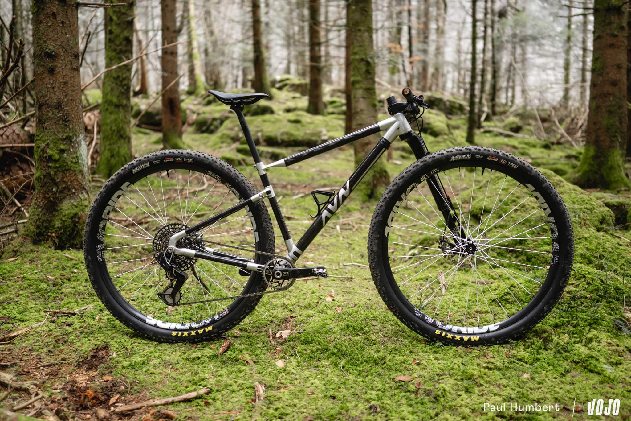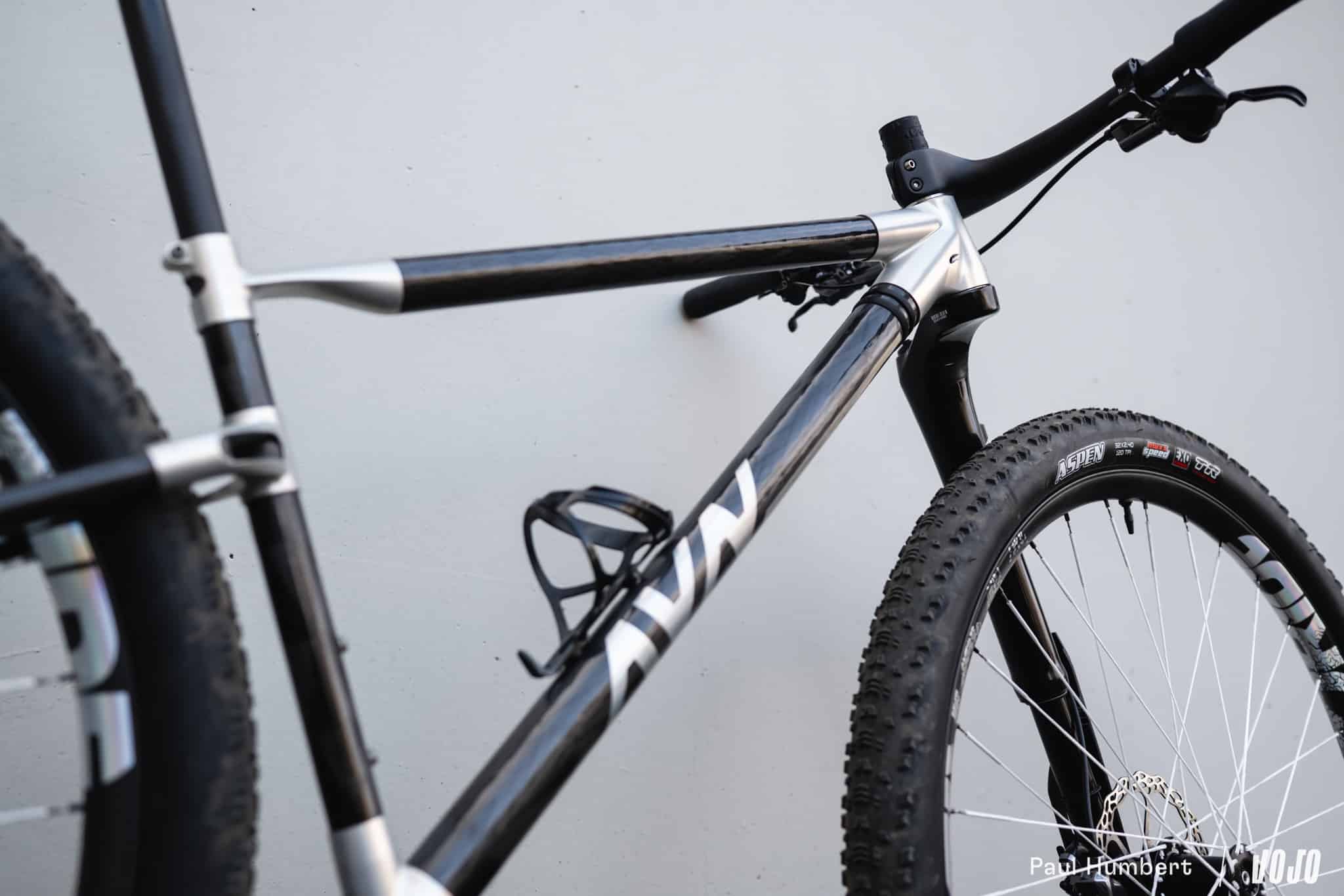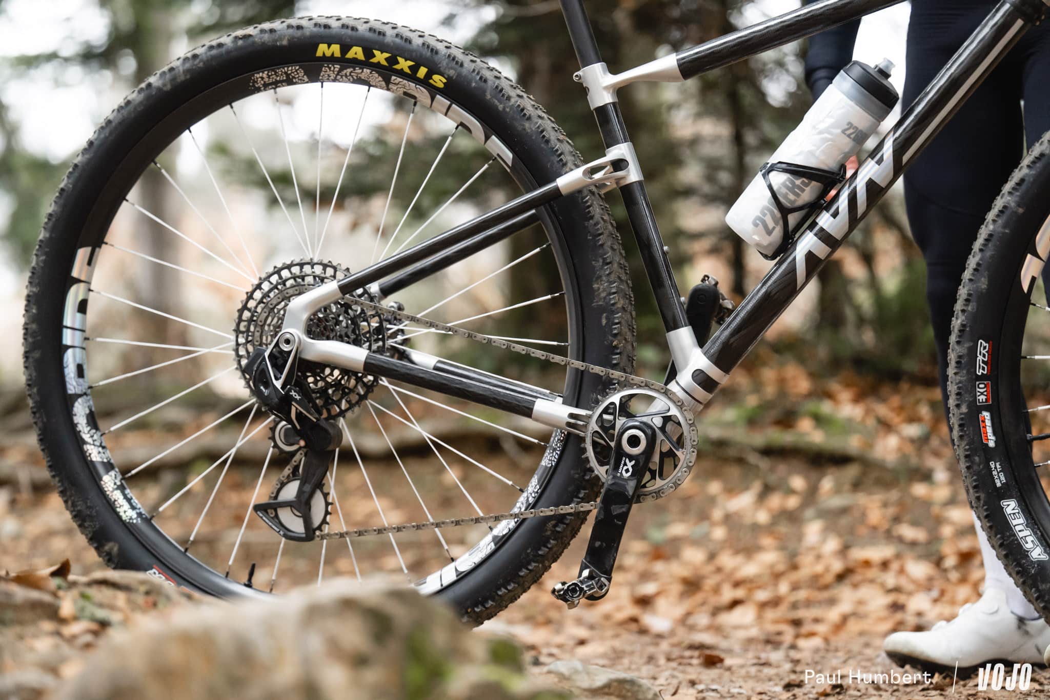 Clément Auvin précise : « Pour un vélo de compétition, on veut que ce soit nerveux, on veut garder une position qui est assez agressive et on veut un vélo qui est stable. Globalement, pour que ce soit nerveux, il faut que les masses en rotation soient légères. Ça va un peu à l’encontre du 32, et on veut que le vélo soit relativement compact. Les roues de 32 étant plus grandes, on veut mettre des bases plus longues, mais c’est ce qu’on a évité de faire puisqu’on a réussi à garder des bases de 430 mm. C’est même plus court que certains 29 pouces. Pour cela, nous avons utilisé un moyeu superboost à la place du classique boost à l’arrière (157 mm d’entraxe contre 148 mm). »