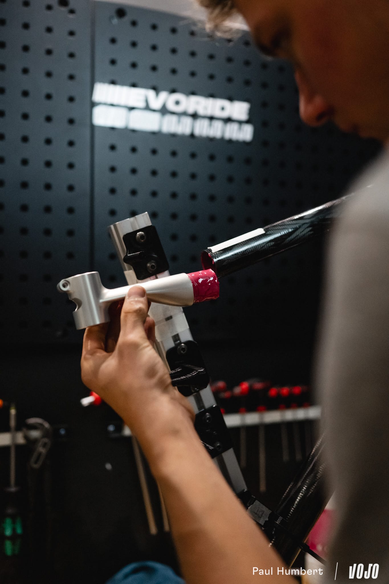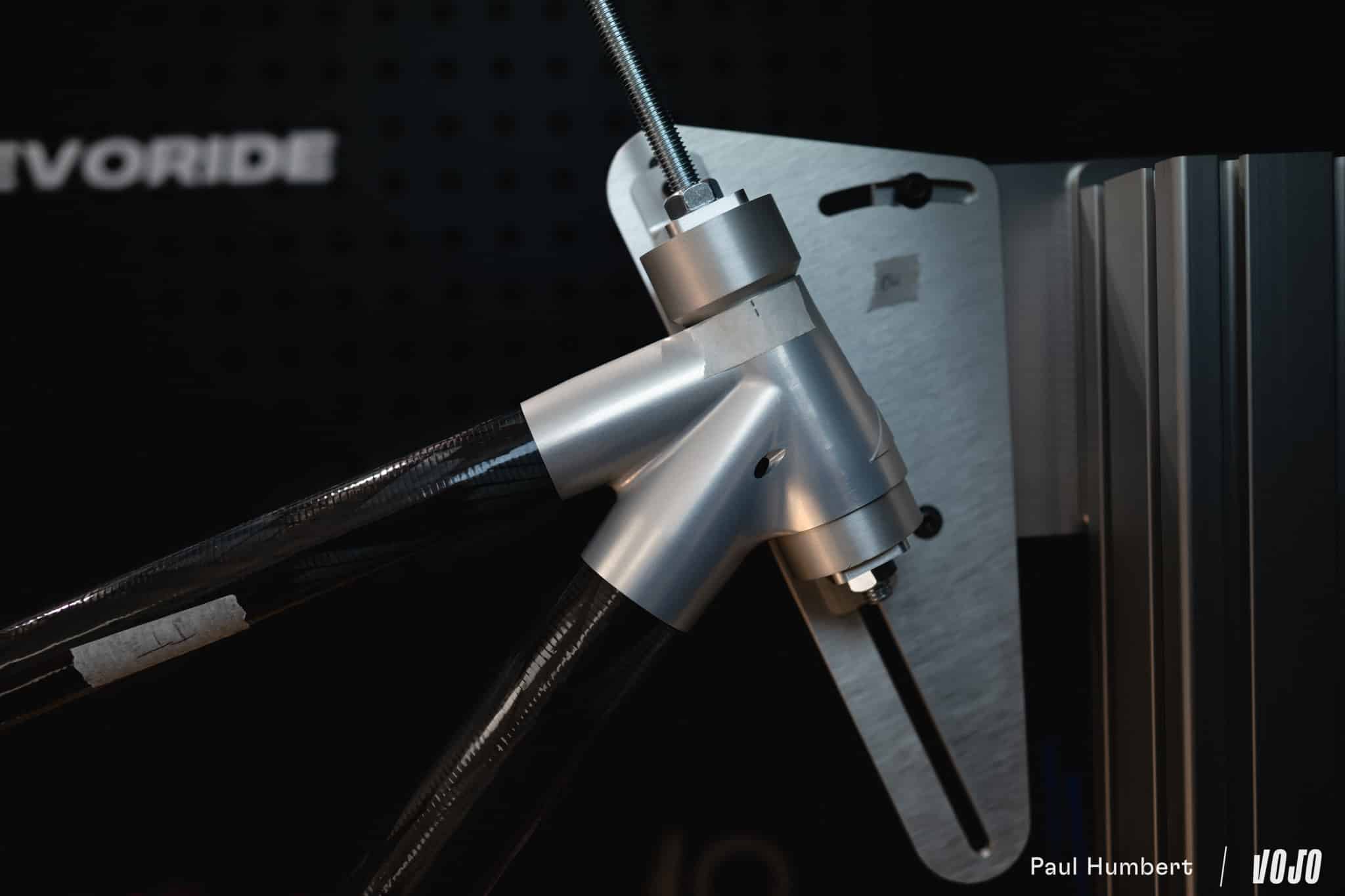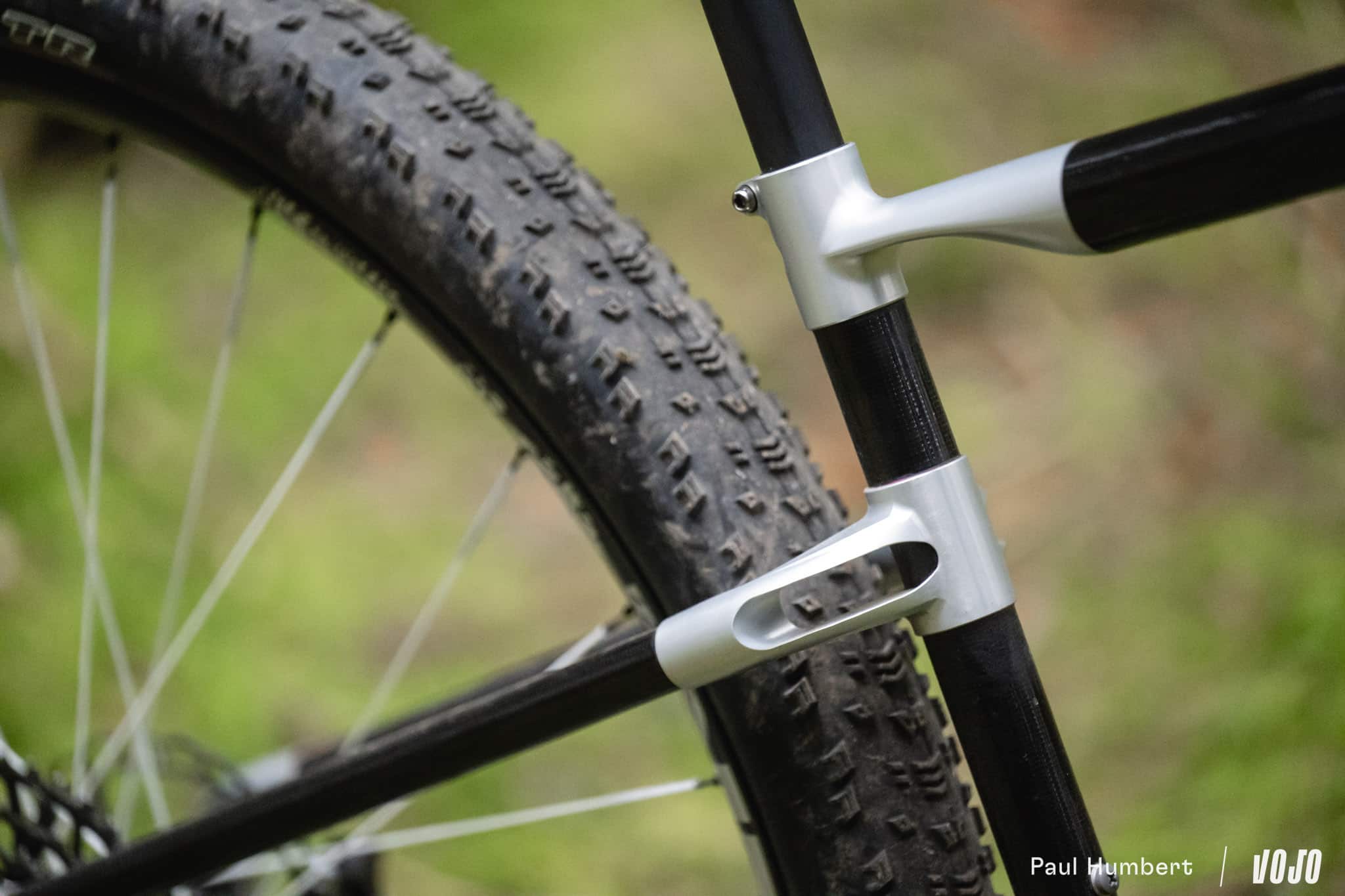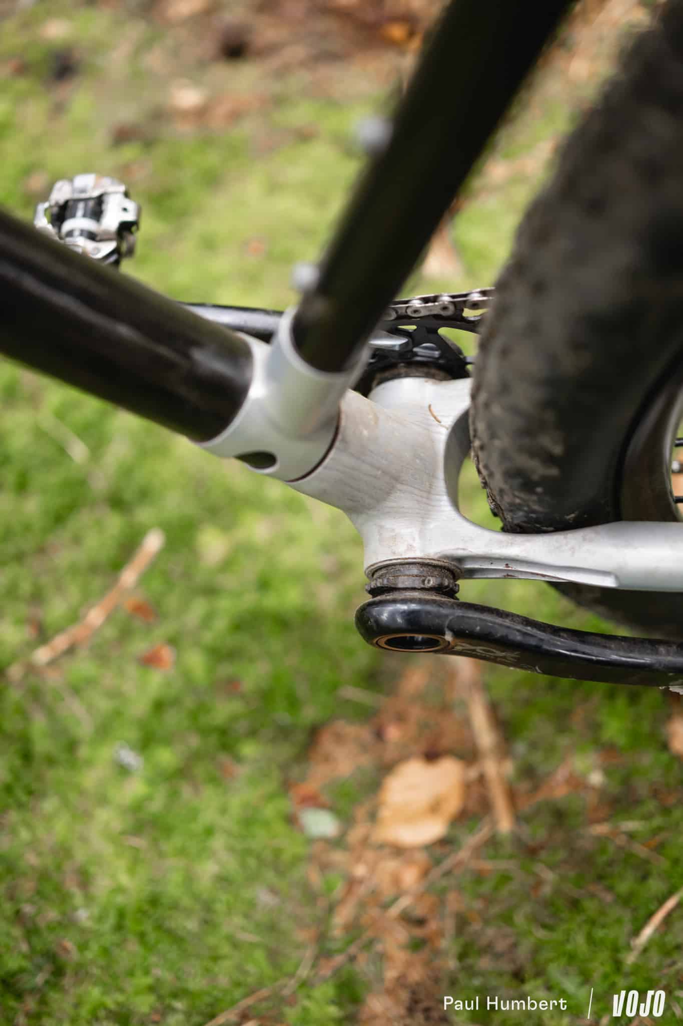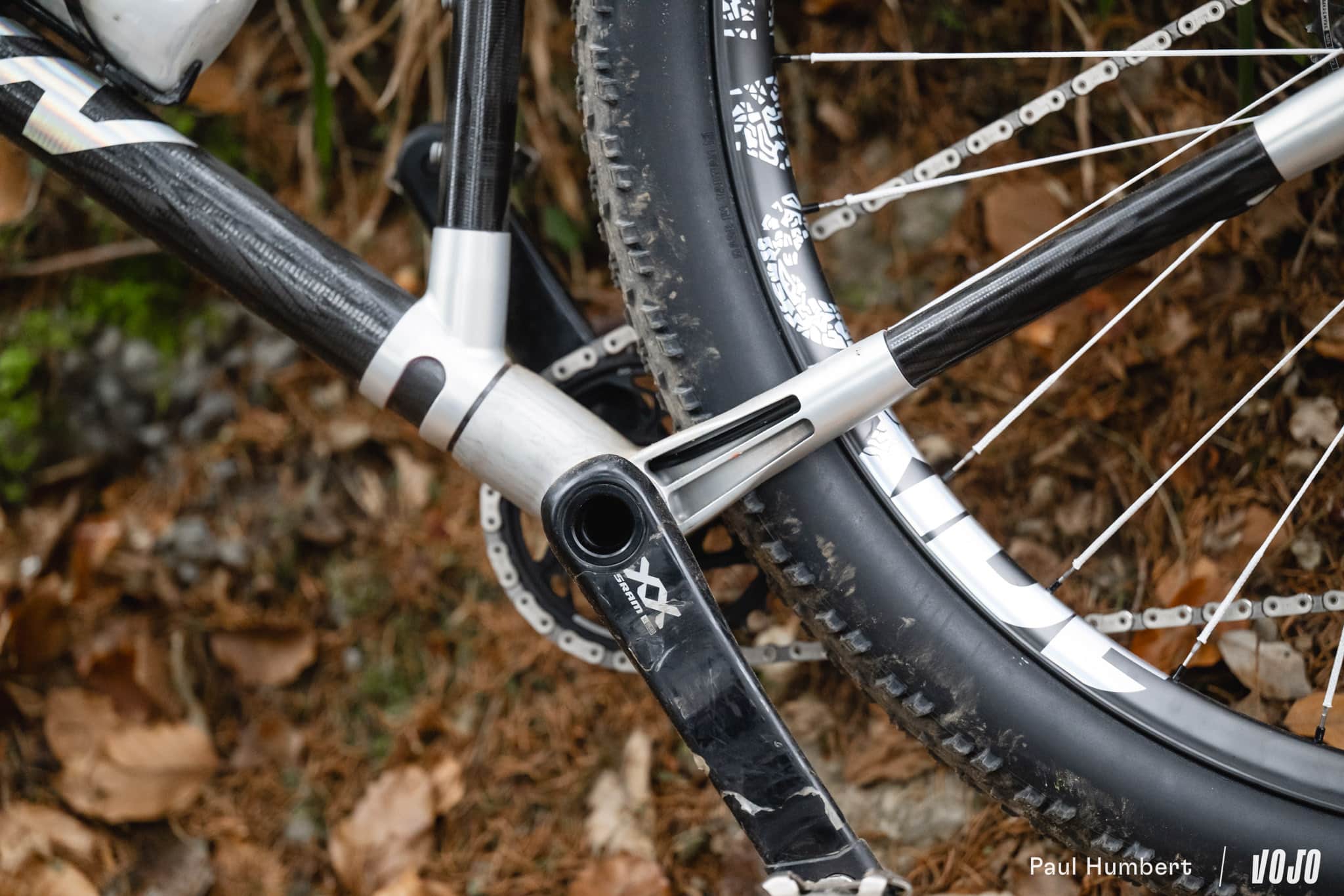 « La troisième problématique concerne la position et le stack (hauteur du cadre), le reach (profondeur du cadre) étant facile à conserver. C’est un casse-tête si on veut garder un débattement cohérent avec un VTT XC, parce qu’on ne veut pas faire un 32 pouces tout rigide, ni sur lequel on est trop haut perché. On a donc conçu une douille de direction très basse. »