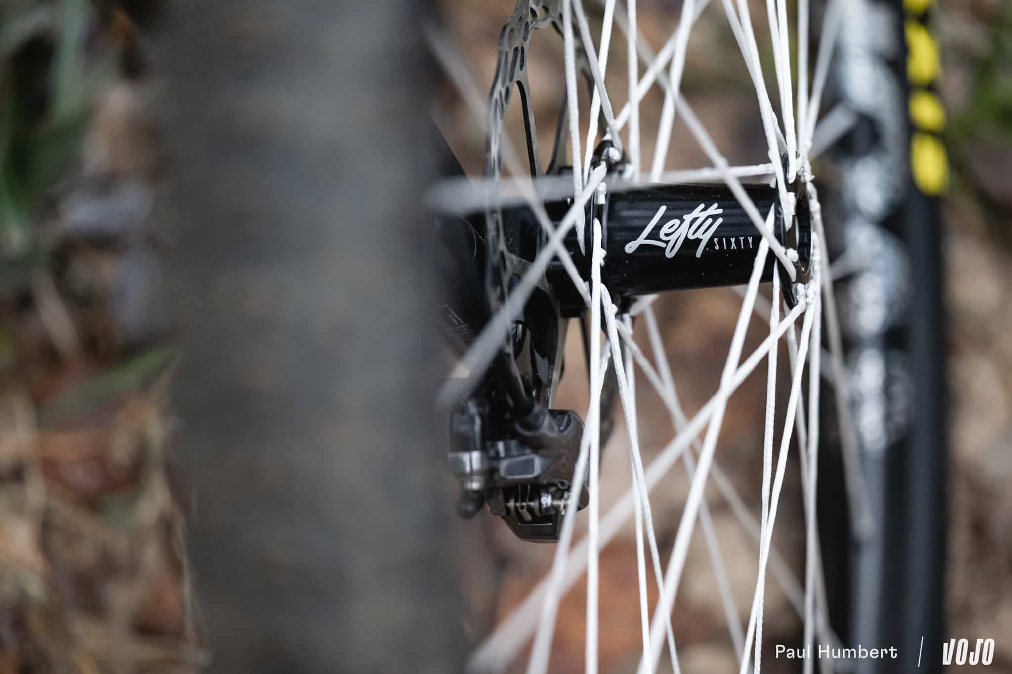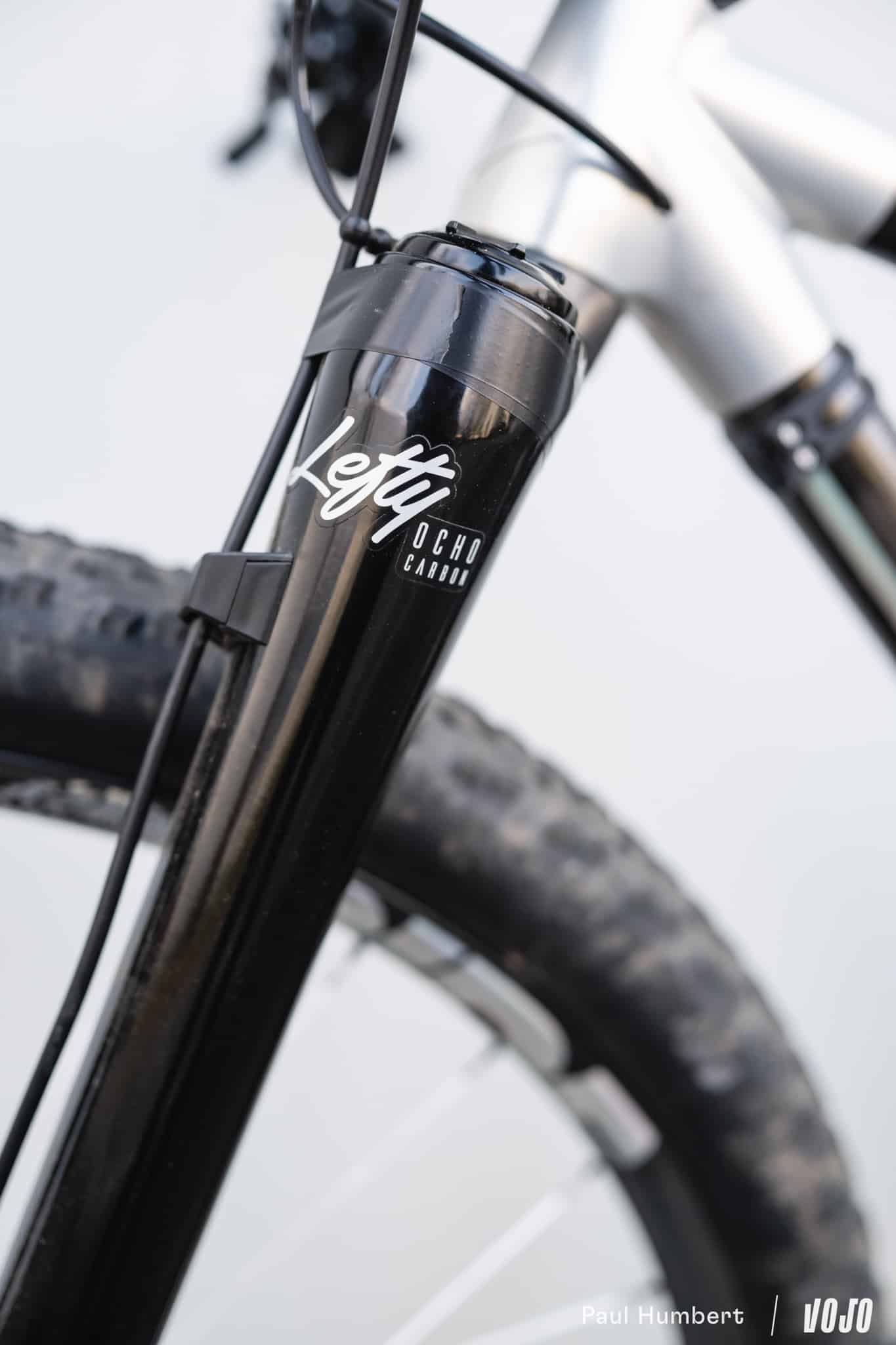Côté suspension, peu de fourches sur le marché permettent le montage d’une roue de 32 pouces avec des pneus de VTT. Pour la majorité des fourches du marché, l’arceau de la fourche est un frein majeur. Nous avons ainsi sollicité Cannondale, qui a mis à notre disposition une Lefty Ocho Carbone au débattement réduit. Ici, pas d’arceau, et la réduction du débattement à 90 mm permet d’éviter que la roue ne touche le cadre en se comprimant.