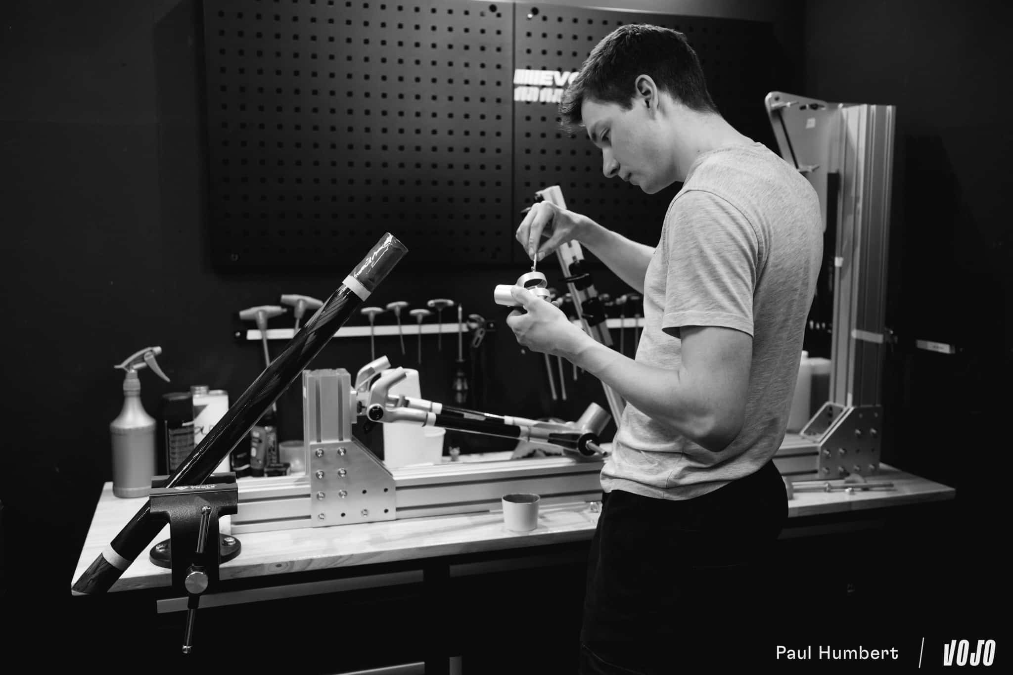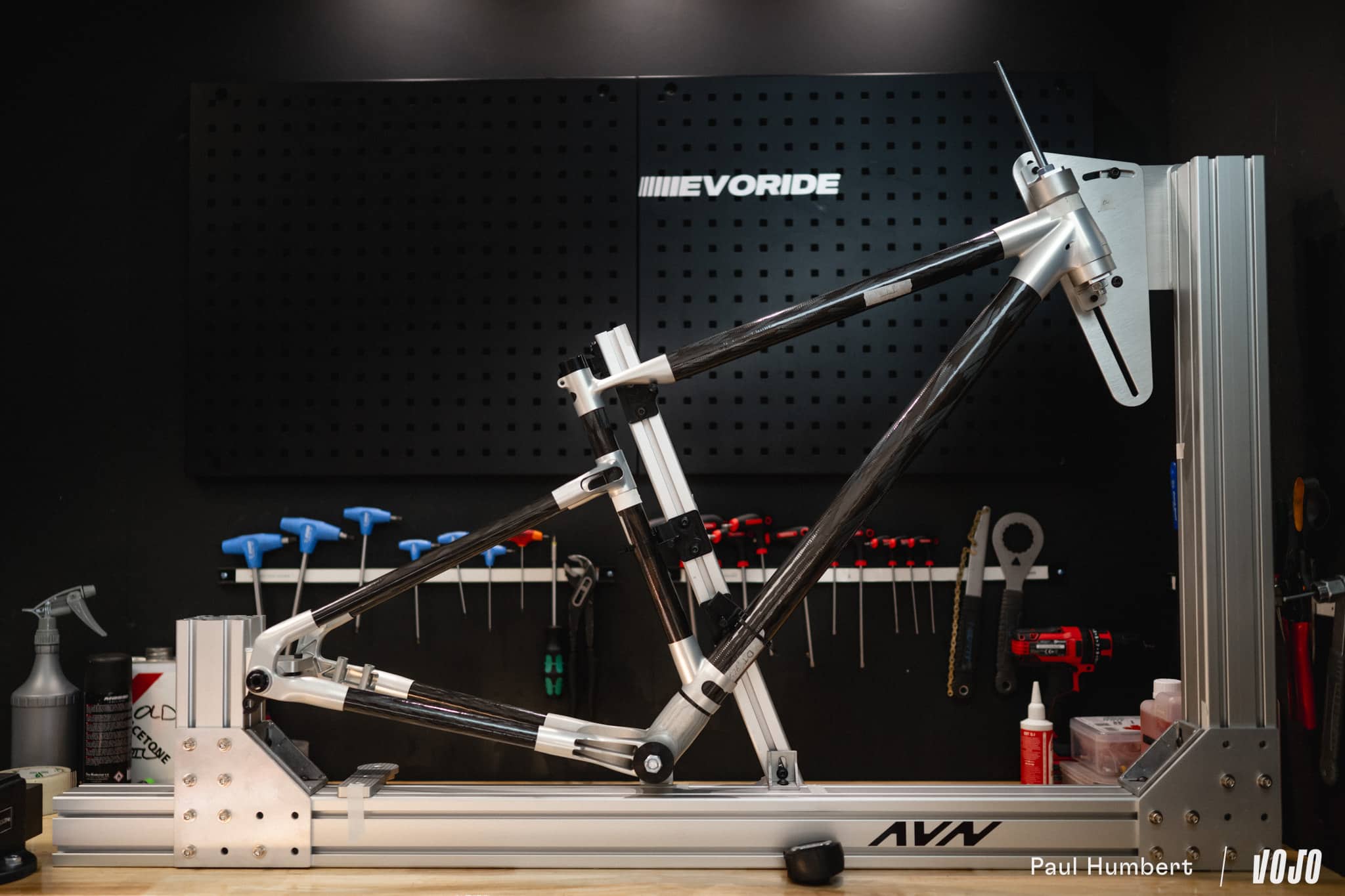 À ses côtés, on retrouve Clément Auvin, un jeune ingénieur qui conçoit les roues et futurs moyeux Evoride. En parallèle, Clément travaille à la conception de cadres de vélos. Après un vélo de route réalisé en manchonné-collé, il a été en charge de la conception de ce prototype de 32 pouces. Il signe ses vélos de la marque AVN.