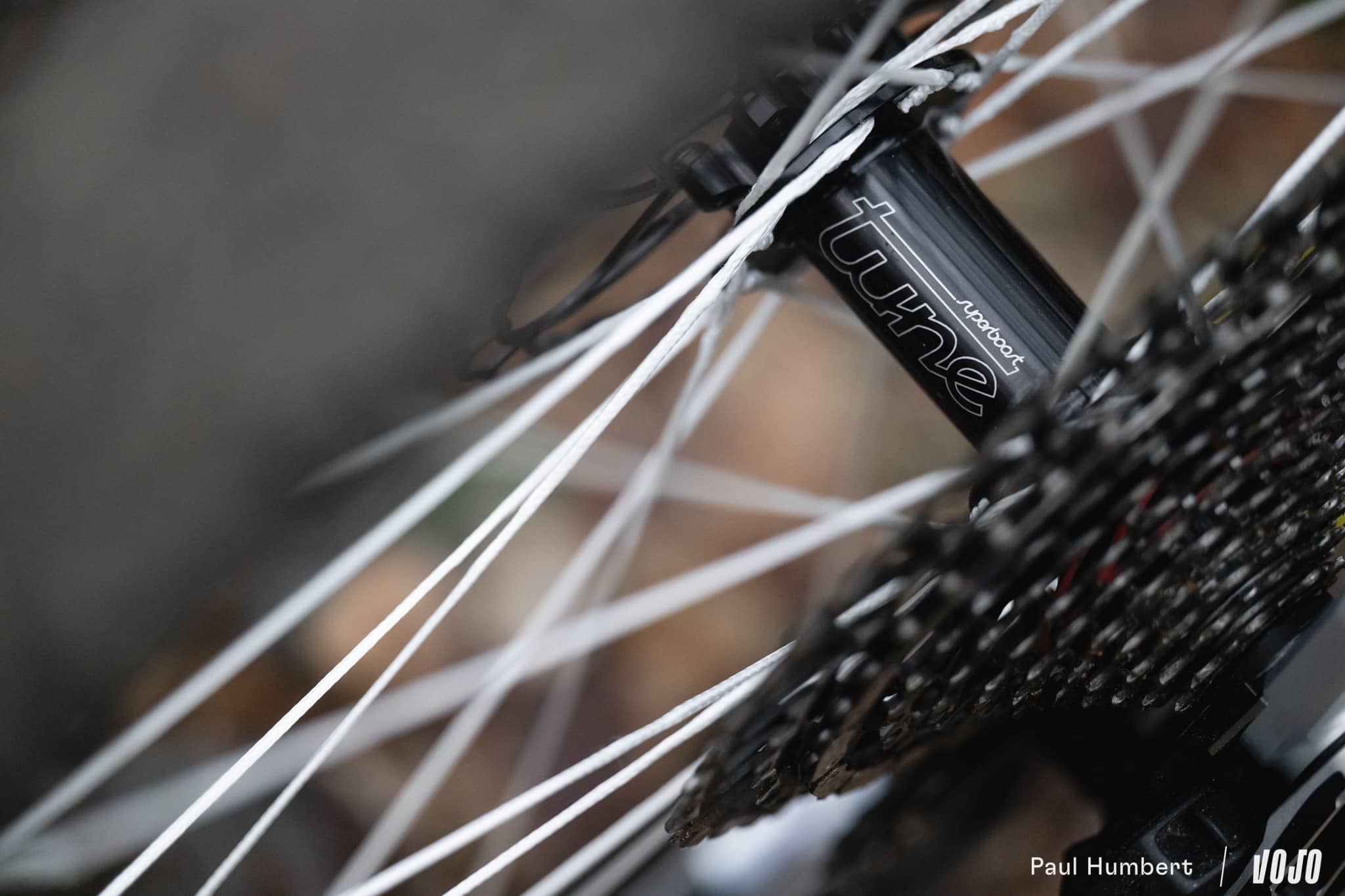 Ce nouveau standard impose des changements sur des composants clés. Les roues, évidemment, et Evoride a pu proposer un montage sur la base d’un cercle carbone 32, associé à un moyeu Tune Superboost à l’arrière, et le moyeu Cannondale Lefty à l’avant. Le tout est monté avec des rayons textiles Berd.