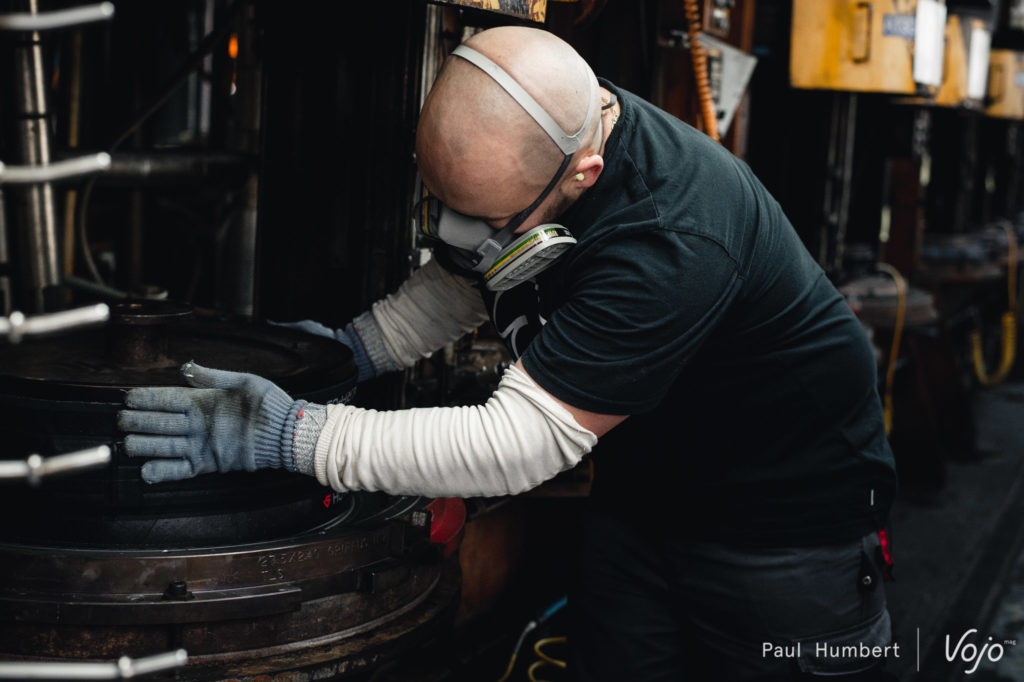 Notre pneu assemblé et collé est positionné dans le moule par des opérateurs. Le tout est installé dans un grand four qui n’est pas sans évoquer un moule à gaufre.