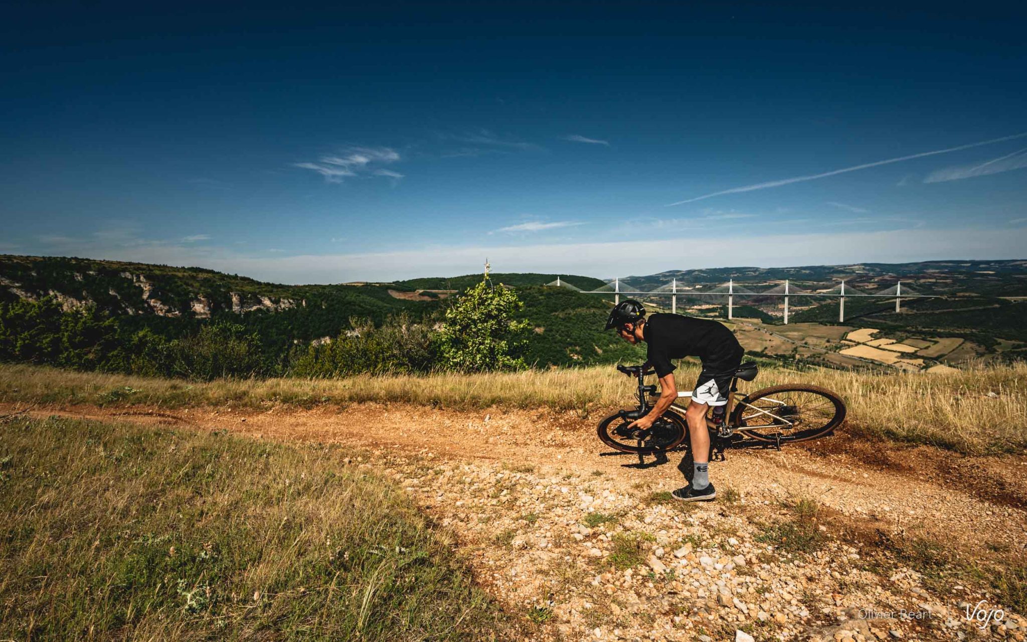 Le VTT enduro est aussi présent, avec une course organisée le samedi. Le centre névralgique se trouve cette fois sur le site de Brunas, sur les hauteurs de Millau, en plein plateau du Larzac. La photo ci-dessus résume bien la mixité qui est à la base de la philosophie des NG, avec la Highline qui se trouve aussi à cet endroit et sous laquelle passe l’enduro VTT !
