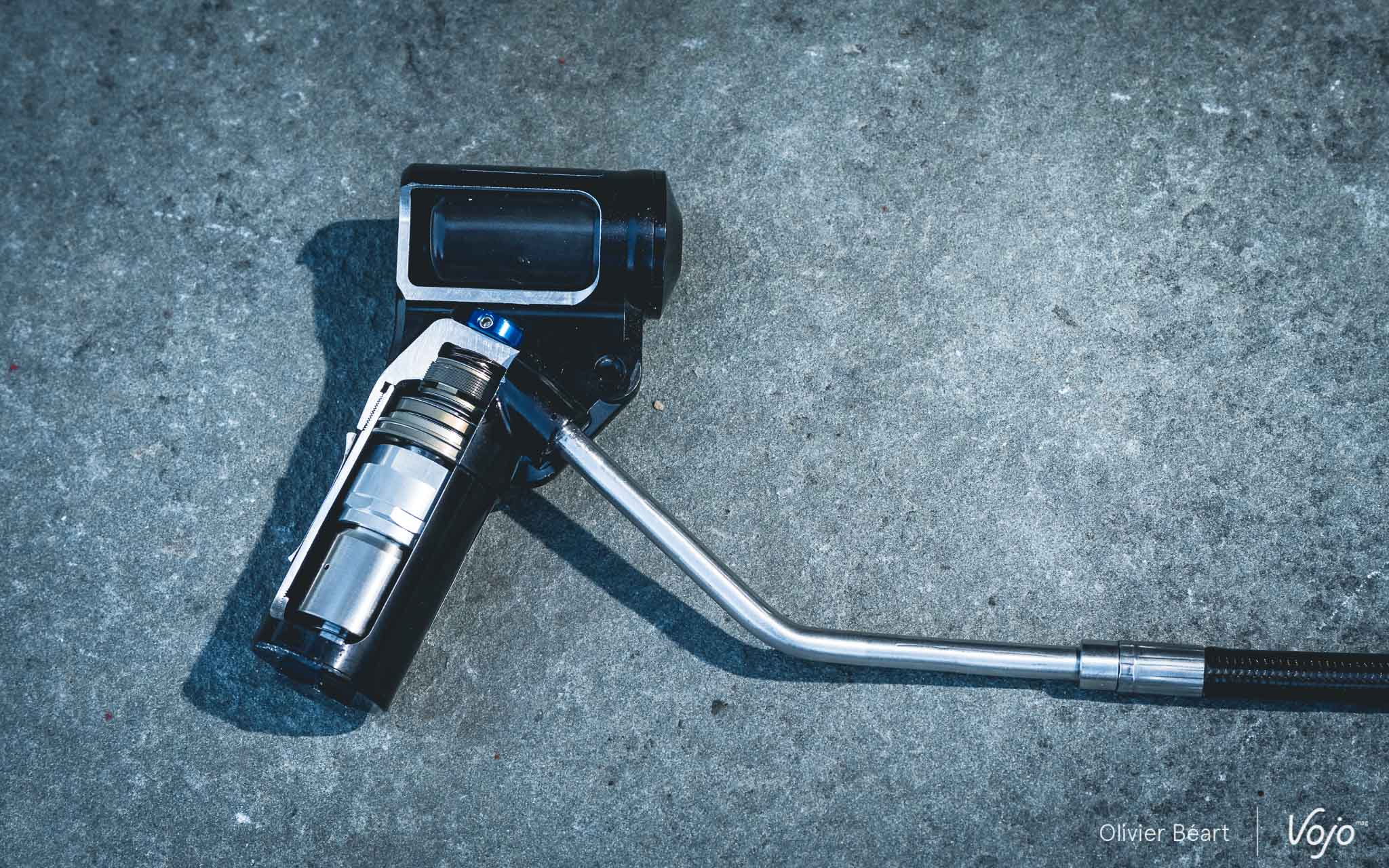 Outre un trajet très droit entre le Brain et l’amortisseur, le passage de l’huile se fait désormais à travers du « yoke » qui assure la liaison entre l’amortisseur et la biellette, toujours pour assurer une transmission la plus directe possible. Le petit levier bleu qu’on aperçoit sur le Brain permet le réglage de la sensibilité sur 5 positions.